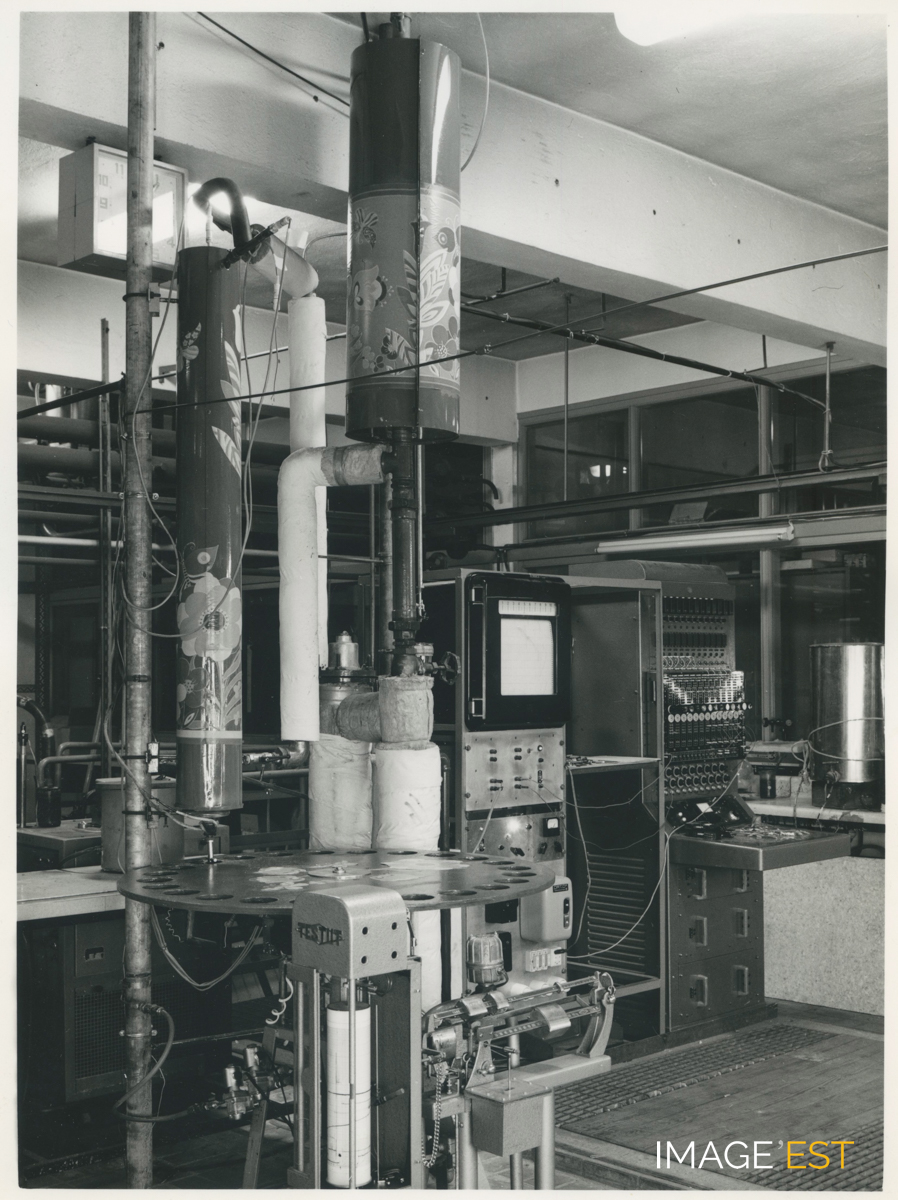 Laboratoire de l'École nationale supérieure des industries chimiques (ENSIC) à Nancy (Meurthe-et-Moselle). Cachet du photographe " Charles André Nancy n° 11- 5689 ". Une mention manuscrite au verso précise : " Installation de cristallisation et de fusion fractionnée discontinues commandées par ordinateur ".