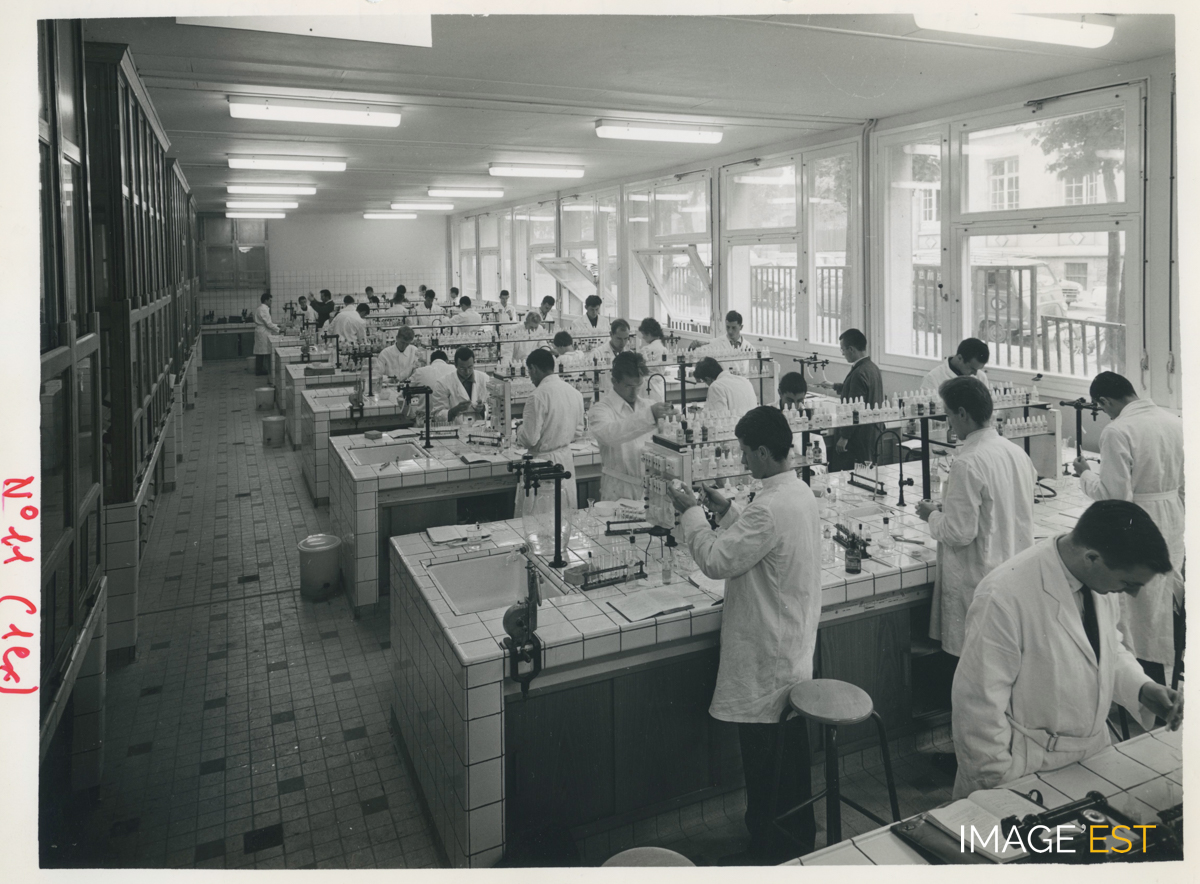 Laboratoire de l'École nationale supérieure des industries chimiques (ENSIC) à Nancy (Meurthe-et-Moselle). Cachet du photographe " Charles André Nancy n° 2881 ". Une mention manuscrite au verso précise : " ENSIC - Bâtiment Déglin - Rez-de-Chaussée - Un grand laboratoire de tracvaux pratiques ".