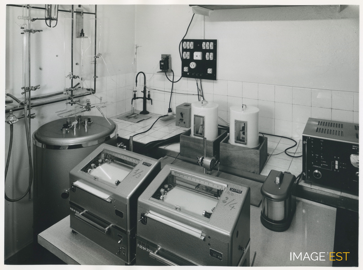 Laboratoire de l'École nationale supérieure des industries chimiques (ENSIC) à Nancy (Meurthe-et-Moselle). Cachet du photographe " Charles André Nancy n° 2881 ". Une mention manuscrite au verso précise : " ENSIC - Bâtiment Déglin - Rez-de-Chaussée - Un grand laboratoire de tracvaux pratiques ".