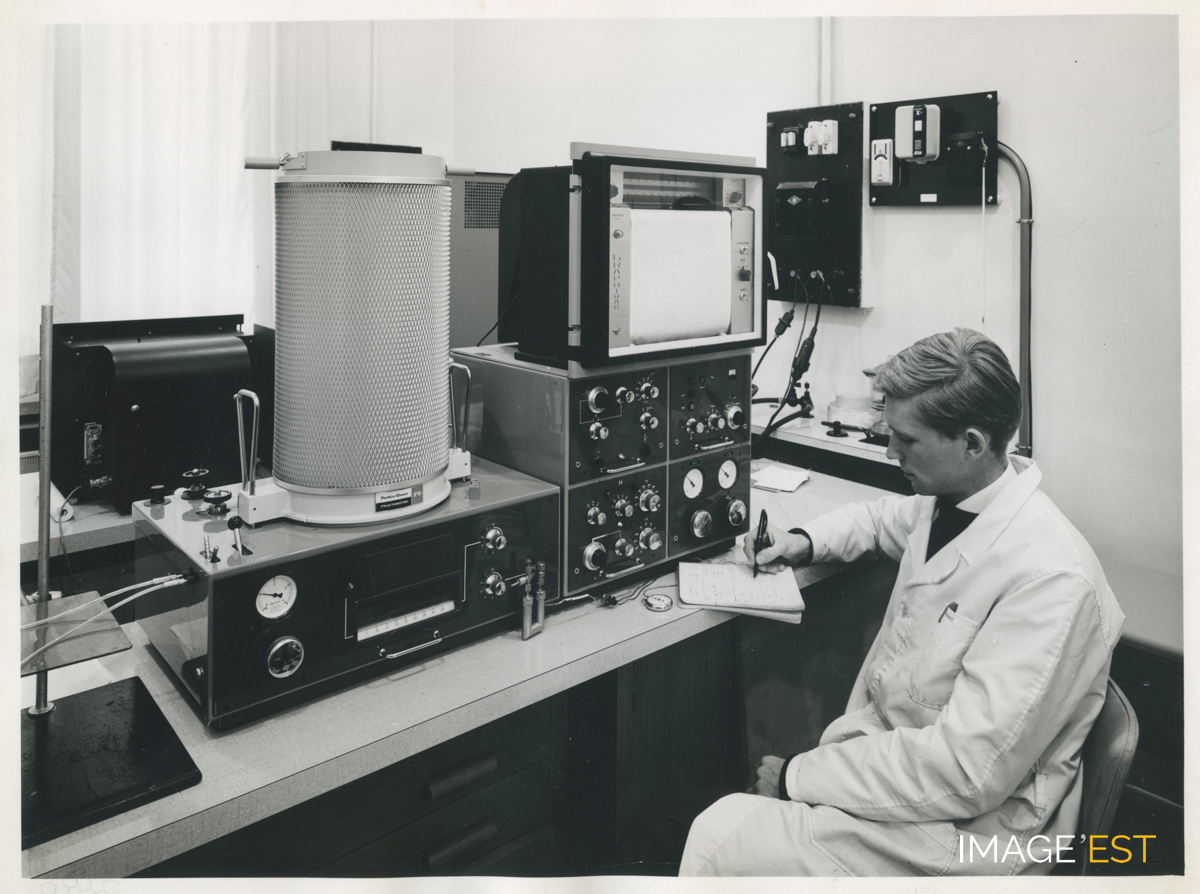 Laboratoire de l'École nationale supérieure des industries chimiques (ENSIC) à Nancy (Meurthe-et-Moselle). Cachet du photographe " Charles André Nancy n° 76-4107 ". Une mention manuscrite au verso précise : " Installation de chromatigraphie en phase gazeuse destiné à l'étude de la pyrolyse de composés organiques Niclause ".