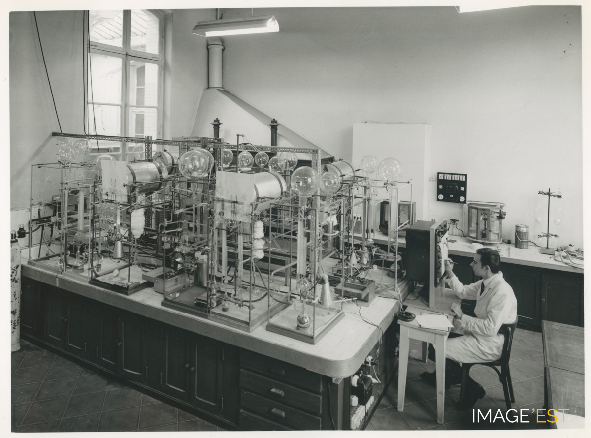 Laboratoire de l'École nationale supérieure des industries chimiques (ENSIC) à Nancy (Meurthe-et-Moselle). Cachet du photographe " Charles André Nancy n° 87-4107 ".