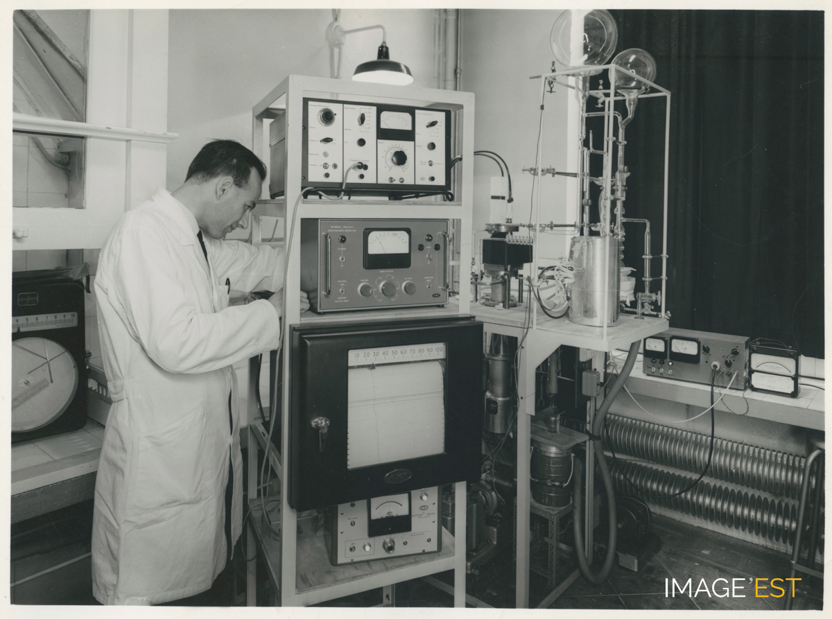 Laboratoire de l'École nationale supérieure des industries chimiques (ENSIC) à Nancy (Meurthe-et-Moselle). Cachet du photographe " Charles André Nancy n° 88-4107 ". Une mention manuscrite au verso précise : " Spectromètre de masse destiné à l'étude de la décomposition d'hydrocarbures ".