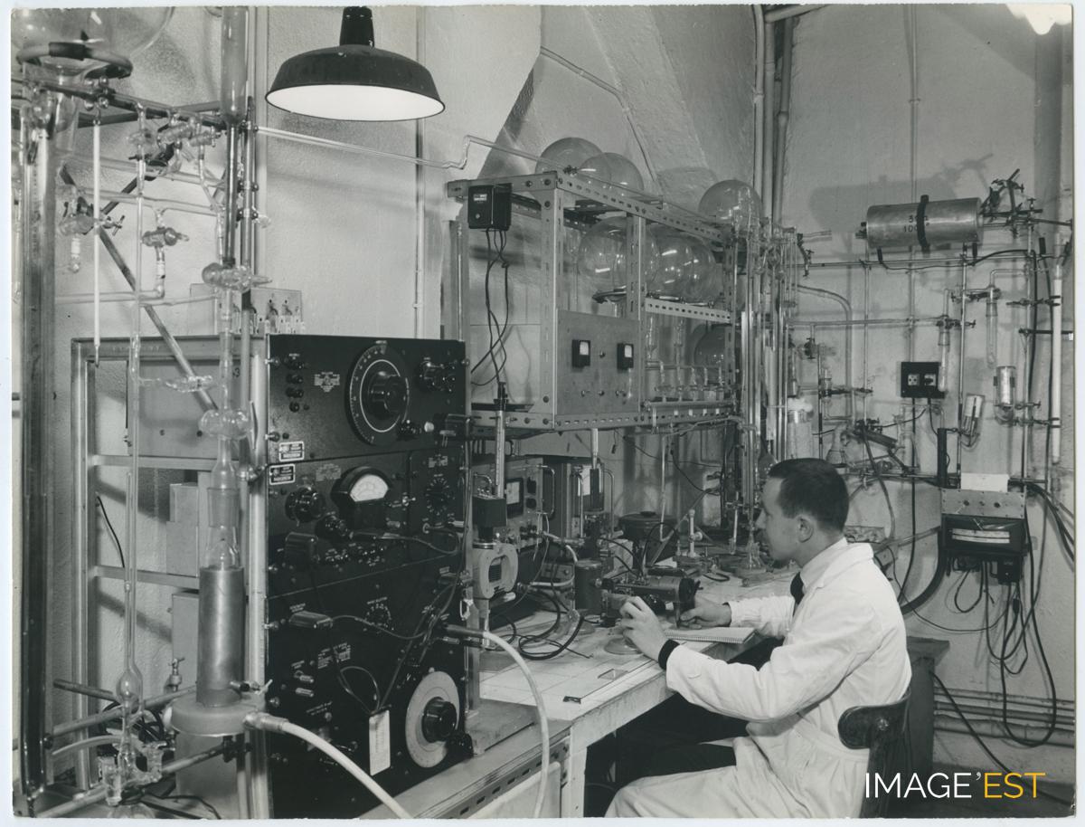 Laboratoire de l'École nationale supérieure des industries chimiques (ENSIC) à Nancy (Meurthe-et-Moselle). Cachet du photographe " Charles André Nancy n° 22 2951 ". Une mention manuscrite au dos précise : " J.L. Rivail au labo Barriol ".