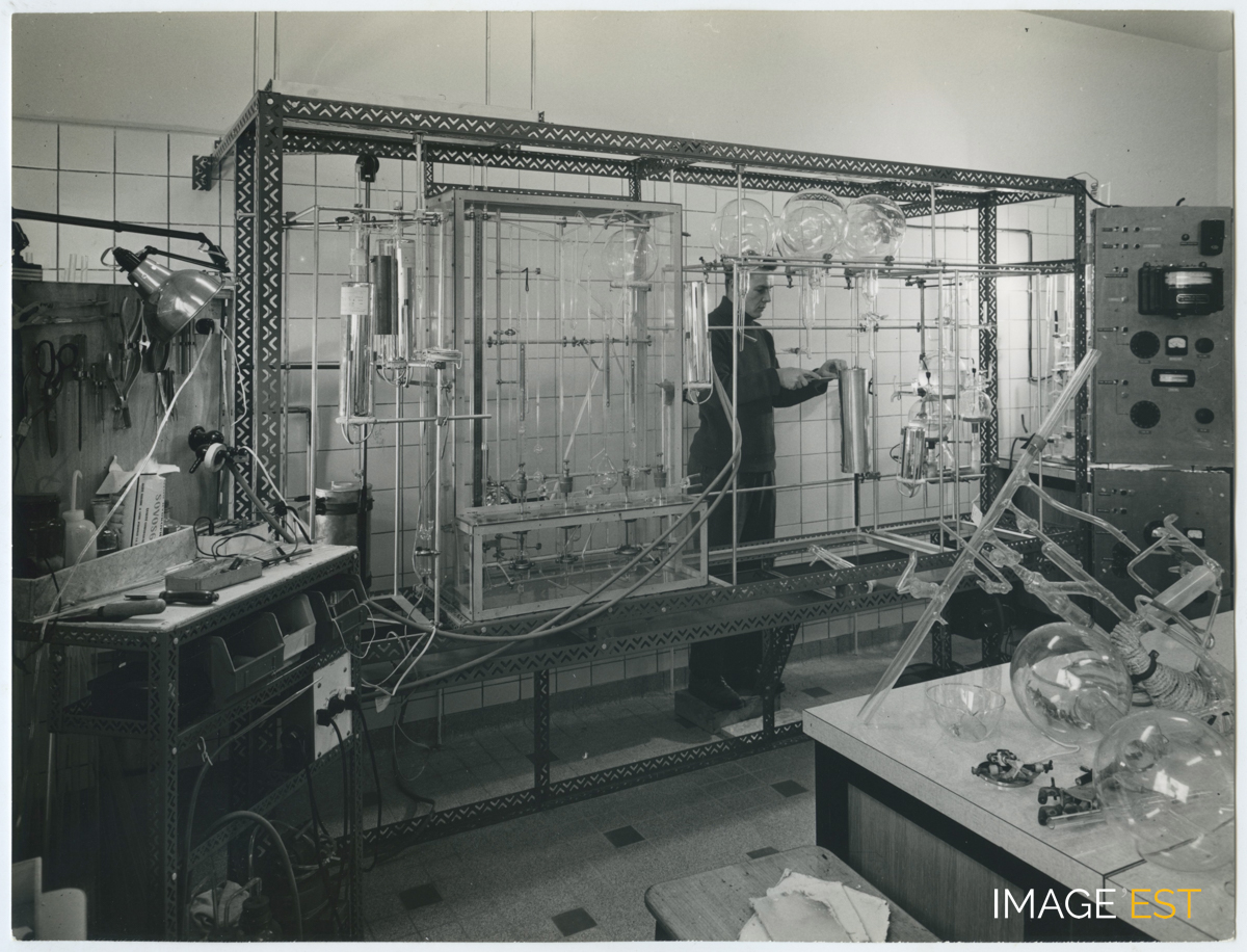 Laboratoire de l'École nationale supérieure des industries chimiques (ENSIC) à Nancy (Meurthe-et-Moselle). Cachet du photographe " Charles André Nancy n° 26 2951 ". Une mention manuscrite au dos précise : " Prof. Hérold ".
