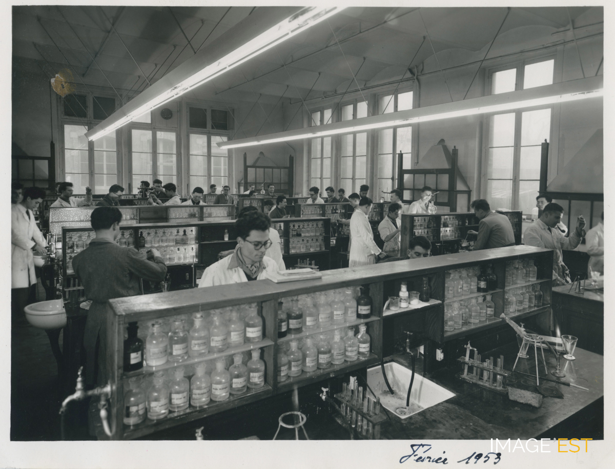 Laboratoire de l'École nationale supérieure des industries chimiques (ENSIC) à Nancy (Meurthe-et-Moselle). Cette photographie est extraite d'un album noir, format à l'italienne (21,5 x 33 cm) et porte la légende suivante sur un calque : " Laboratoire de chimie analytique qualitative ". En marge du cliché, mention d'une date : " Février 1953 ". Cachet du photographe " Scherbeck Nancy " au verso.