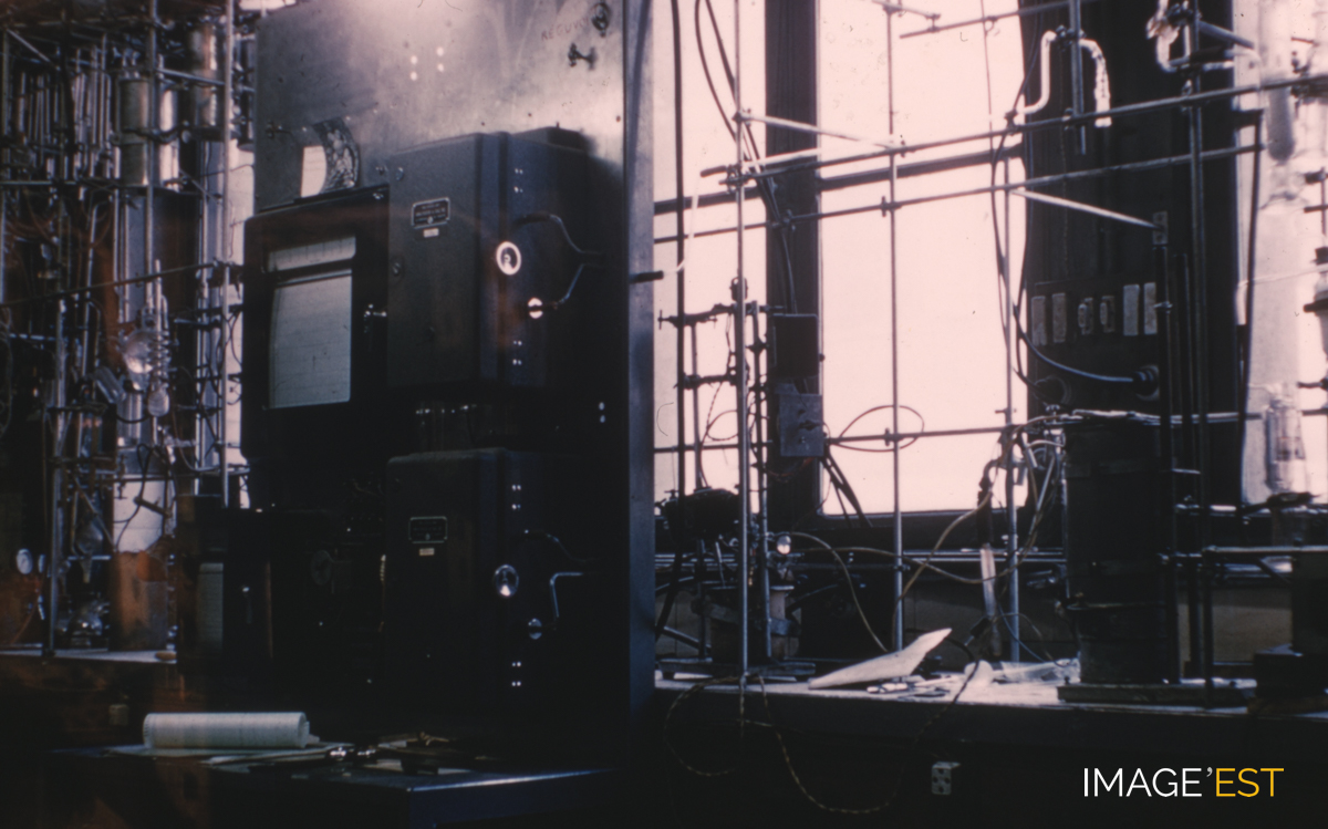 Laboratoire " Heuchamp " de l'École nationale supérieure des industries chimiques de Nancy (Meurthe-et-Moselle). Une mention en marge de la diapositive précise : " Labo Heuchamp ".