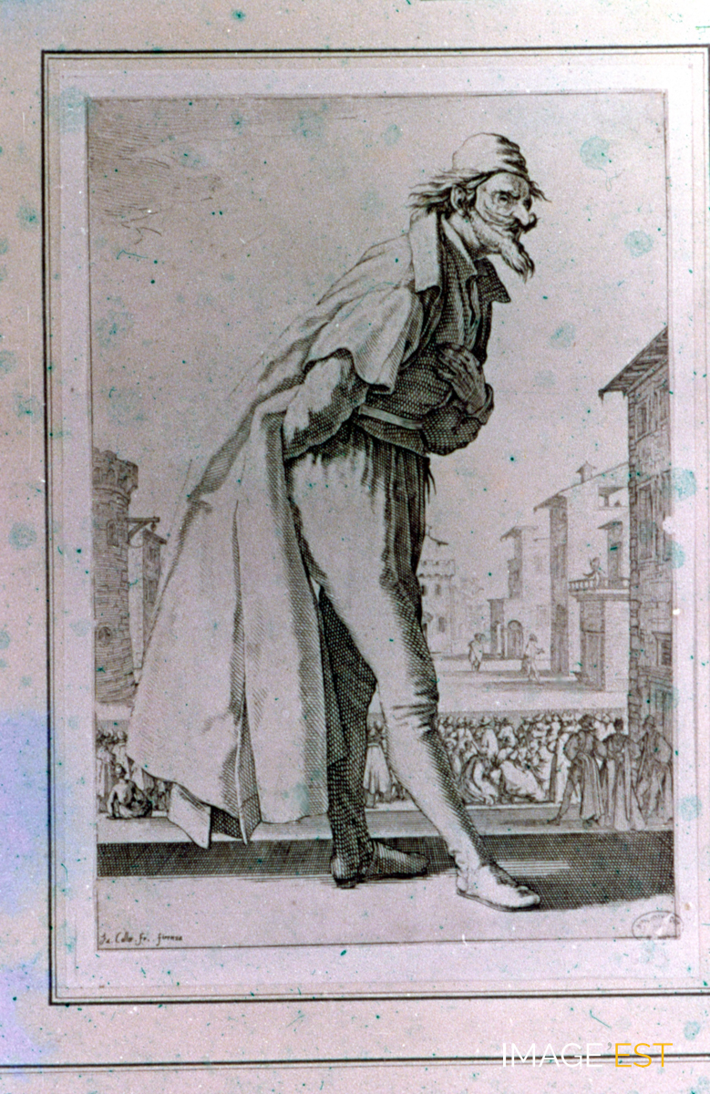 Jacques Callot (1593-1635), témoin de son temps (1re série). Estampe de Jacques Callot (1618). En marge de la diapositive figure la mention : " 6. Le Pantalon ou Cassandre (1618) ". Séries de diapositives sélectionnées et commentées par Jean Hurstel, directeur du Service éducatif des Musées de l'Académie de Nancy-Metz.
