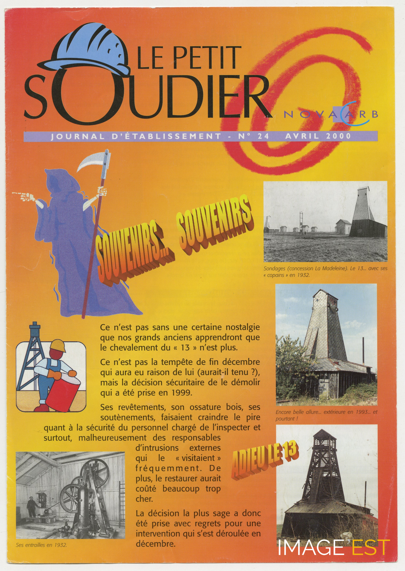 Page de couverture " Le Petit Soudier : journal d'établissement " (n°24, avril 2000) de l'entreprise Novacarb. Dans l'éditorial de ce numéro, il est fait mention de la démolition du chevalement du puits n°13 en décembre 1999.