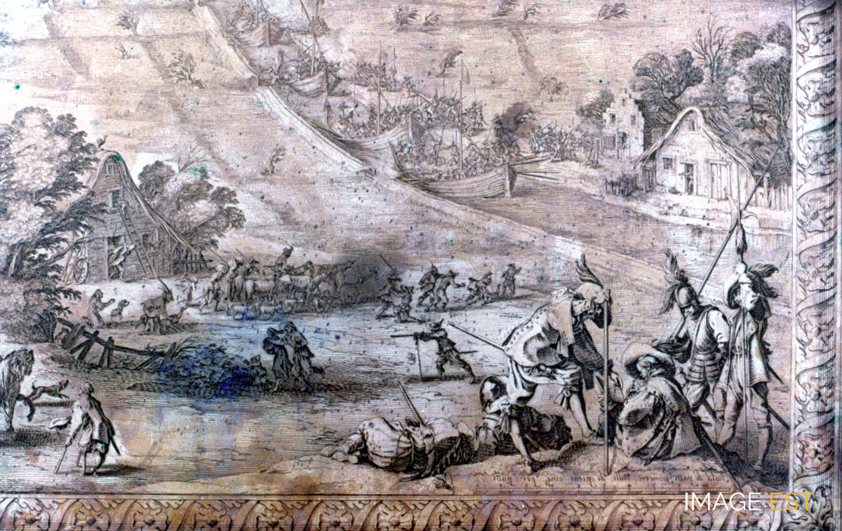 Jacques Callot (1593-1635), témoin de son temps (1re série). Plaque de cuivre de Jacques Callot représentant le siège de Bréda. En marge de la diapositive figure la mention : " 4. Le siège de Bréda de Callot (1627) ". Séries de diapositives sélectionnées et commentées par Jean Hurstel, directeur du Service éducatif des Musées de l'Académie de Nancy-Metz.