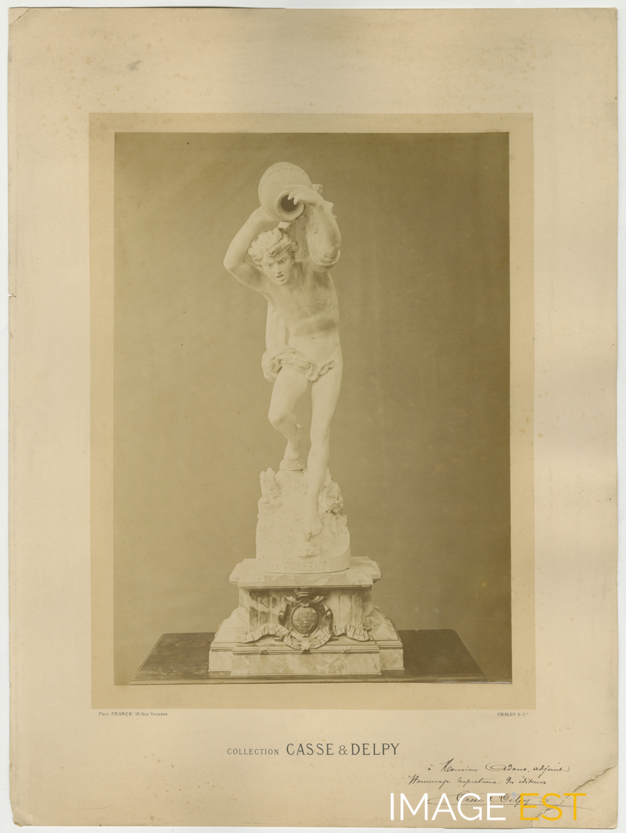 Épreuve au plâtre intitulée " Le Torrent " réalisée par le sculpteur français Urbain Basset (1842-1924). Une mention manuscrite au dos de cette photographie précise : " Urbain Basset - Épreuve au plâtre de la sculpture " Le Torrent " projet de fontaine 1876. Casse et Delpy, fondeurs. Socle marque " À ma Pugnière. Le Conseil municipal de Nancy 22 décembre 1880. Dédicace à Émile Adam ". Une dédicace en bas à doite mentionne : " À Monsieur Adam, adjoint. Hommage respectueux des éditeurs Casse & Delpy ".