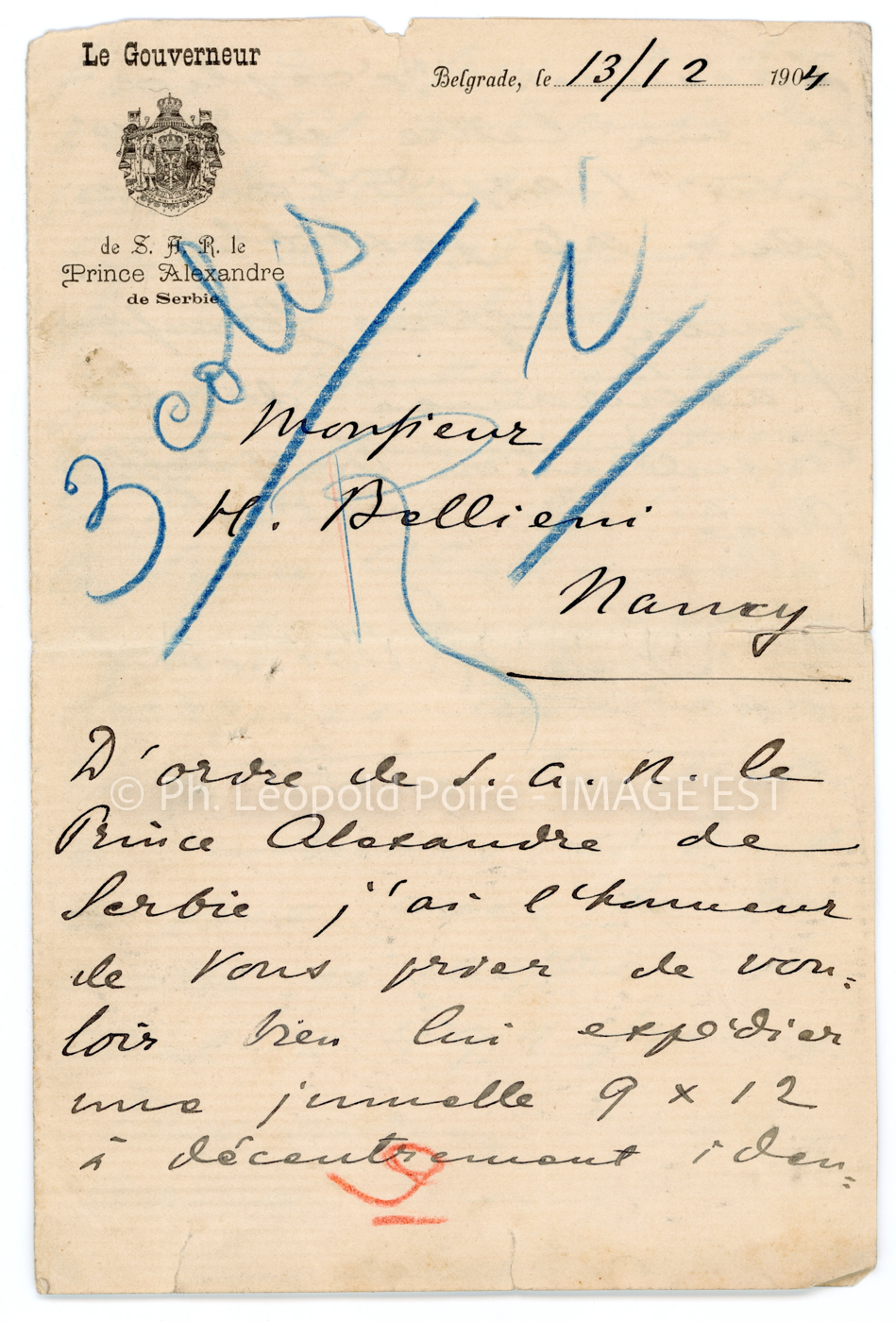 Lettre à en-tête de Son Altesse Royale le Prince Alexandre de Serbie en provenance de Belgrade (Serbie) d'une commande d'une jumelle Bellieni 9 x 12 cm en date du 13 décembre 1904 adressée à la Maison Bellieni de Nancy (Meurthe-et-Moselle).