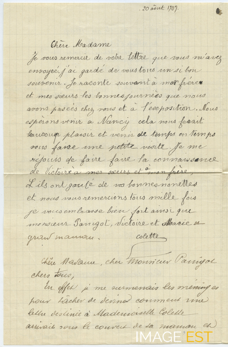 Lettre de remerciement datée du 20 août 1909 de Colette Pattinger, illustratrice (1896-1940?) à Madame Panigot à Nancy (Meurthe-et-Moselle) et début de la lettre de Paul Pattinger adressée à madame et monsieur Panigot.