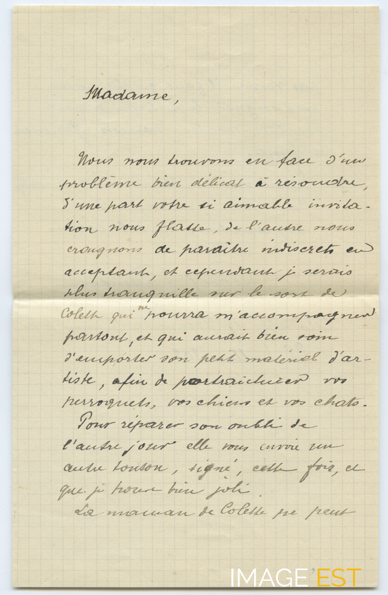 Lettre de Paul Pattinger, père de l'illustratrice Colette Pattinger (1896-1940?) à Madame Octavie Panigot à Nancy (Meurthe-et-Moselle). Paul Pattinger remercie madame Panigot de les inviter et évoque la passion de sa fille pour les animaux : " Je serais plus tranquille sur le sort de Colette qui ne pourra m'accompagner partout, et qui aurait bien soin d'emporter son petit matériel d'artiste afin de portraiturer vos perroquets, vos chiens et vos chats ".