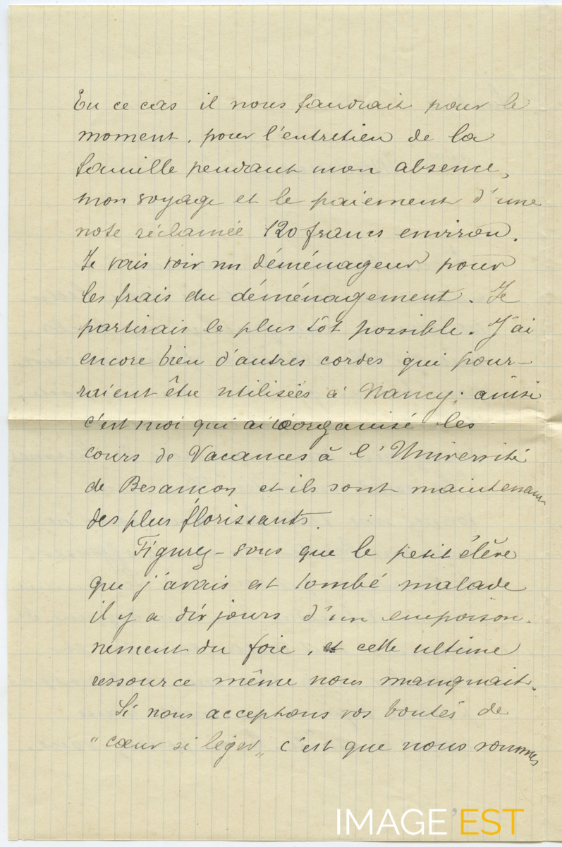 Suite de la lettre de Paul Pattinger, père de l'illustratrice Colette Pattinger (1896-1940?), à Madame Octavie Panigot à Nancy (Meurthe-et-Moselle) où il explique sa situation familiale.