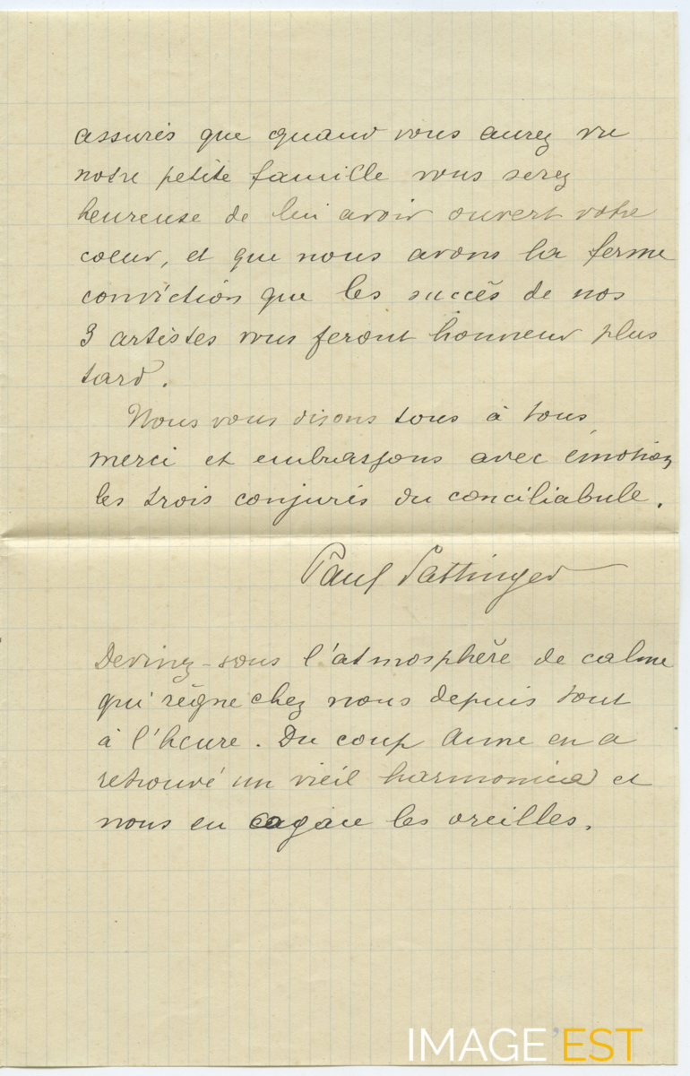 Suite de la lettre de Paul Pattinger, père de l'illustratrice Colette Pattinger (1896-1940?), à Madame Octavie Panigot à Nancy (Meurthe-et-Moselle) où il lui adresse ses remerciements et sa gratitude envers sa famille.