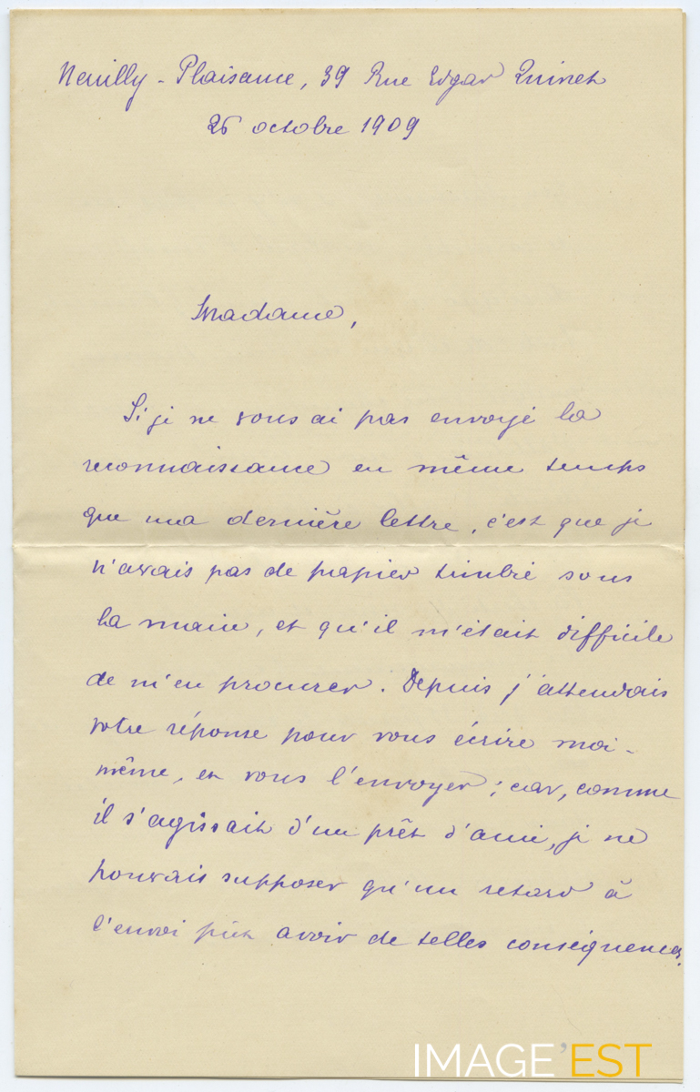 Lettre de Paul Pattinger, père de l'illustratrice Colette Pattinger (1896-1940?) à madame Octavie Panigot. Une mention indique : " Neuilly-Plaisance, 39, rue Edgard Quinet 26 octobre 1909 ".