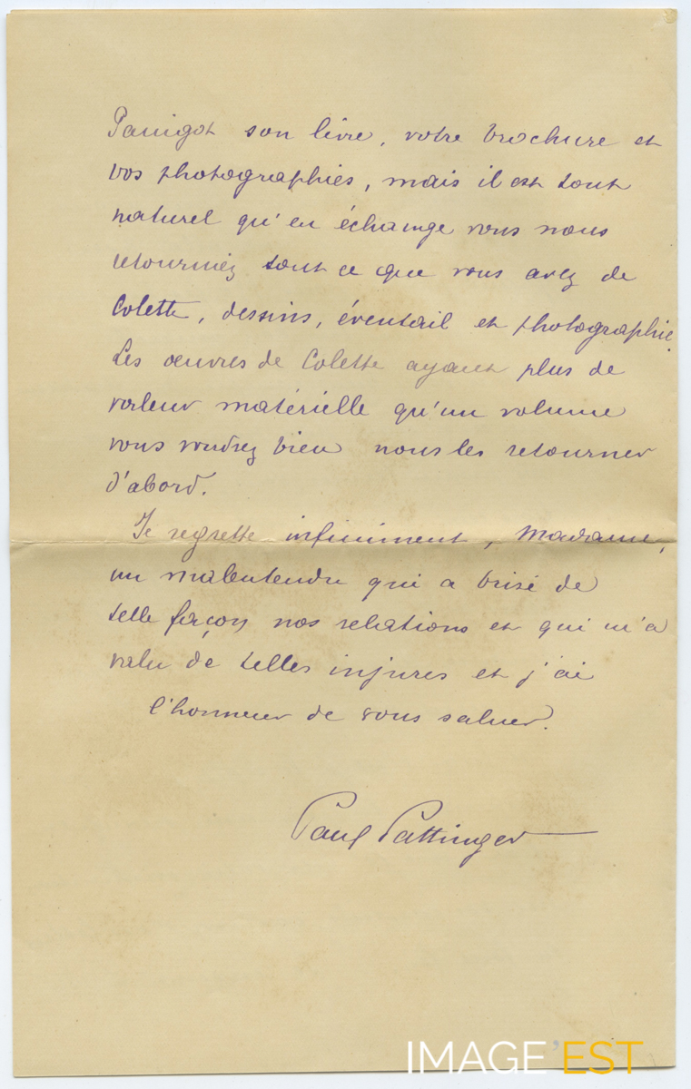 Suite de la lettre de Paul Pattinger, père de l'illustratrice Colette Pattinger (1896-1940?) à madame Octavie Panigot. Paul Pattinger réclame à madame Panigot de lui renvoyer les dessins, éventail et photographies de Colette.