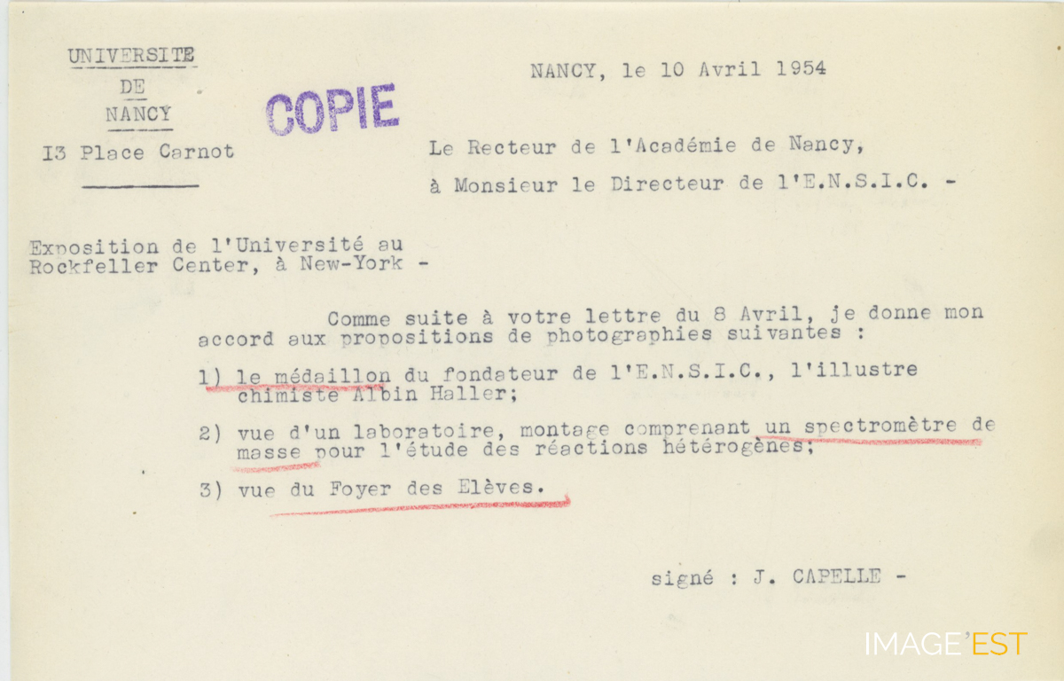 Lettre du 10 avril 1954 de M. le Recteur de l'Académie de Nancy à M. le directeur de l'ENSIC à propos de l'exposition de l'Université au Rockfeller Center à New York et de l'accord donné aux pièces exposées : " Médaillon du fondateur de l'ENSIC, Albin Haller ; vue d'un laboratoire, montage comprenant un spectromètre de masse pour l'étude des réations hétérogènes ; vue du Foyer des élèves ".
