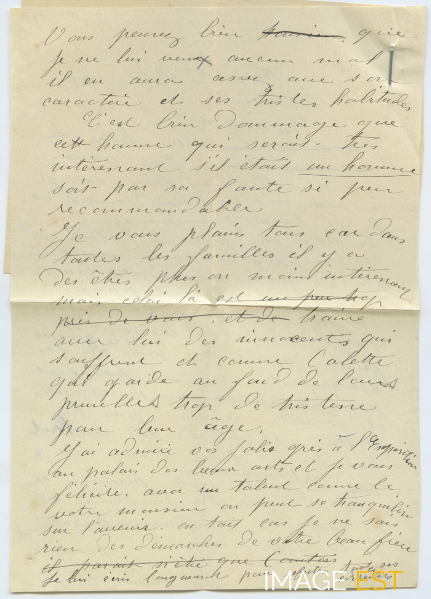 Suite de la lettre en date du 27 octobre 1909 de madame Octavie Panigot confirmant ses rancoeurs envers Paul Pattinger. Elle mentionne à l'intention de Paul Beyer, céramiste, beau-frère de Paul Pattinger, que lors de l'Exposition de Nancy de 1909, elle est allée admirer ses grès au Palais des Beaux-Arts et le félicite.