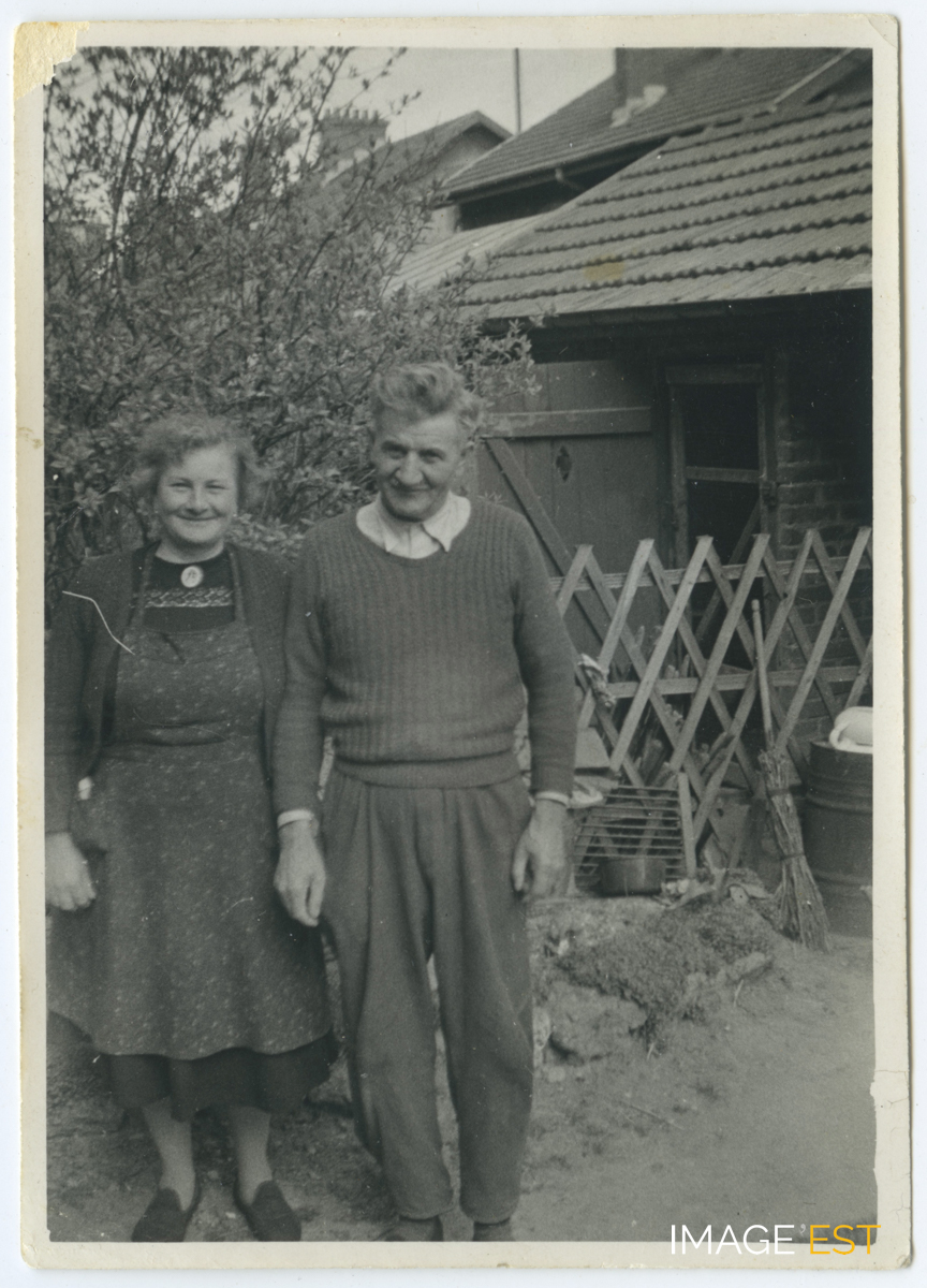 Lucie Philippe et Charles Gitzhoffer dans le jardin arrière d'une maison 14, rue Pasteur aux cités Solvay à Maxéville (Meurthe-et-Moselle). Au verso, une annotation précise : " Fond de jardin côté gauche Charles et Lucie 1958 ".