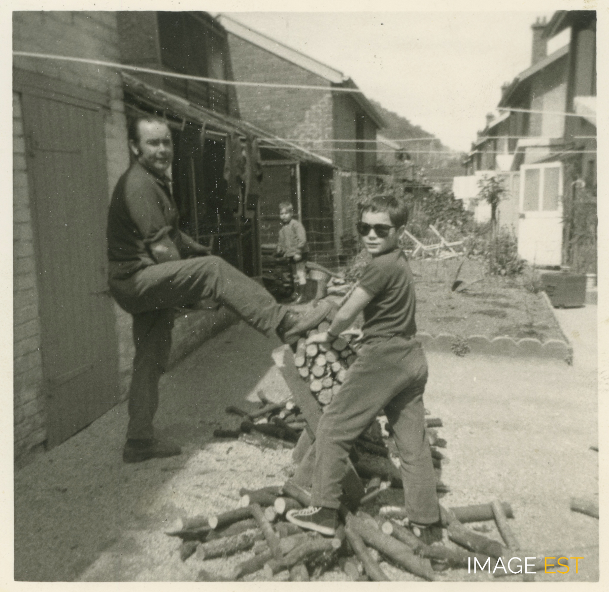 Lucien Vogt coupant du bois avec ses fils, Pascal et Denis, à l'arrière d'une maison des cités Solvay à Maxéville (Meurthe-et-Moselle).