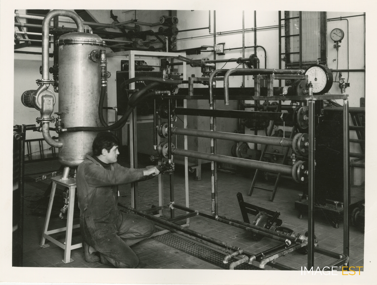 Laboratoire de l'École nationale supérieure des industries chimiques (ENSIC) à Nancy (Meurthe-et-Moselle). Cachet du photographe " Charles André Nancy n° 22- 5689 ". Une mention manuscrite au verso précise : " Probablement M. Jacob, chef d'atelier Grandville ".