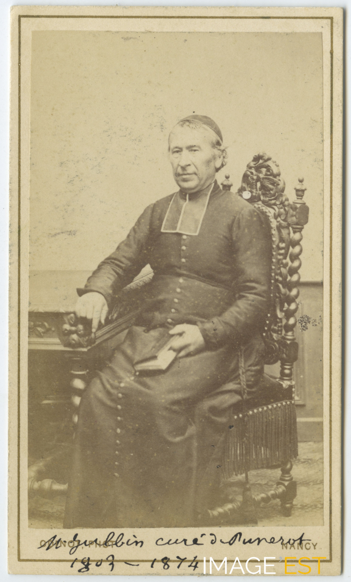 Portrait de " M. Jublin curé de Punerot - 1803-1874 ". Cette photographie est extraite d'un album contenant des portraits de nombreux prêtres ayant exercés dans le département des Vosges entre 1870 et 1910 environ.