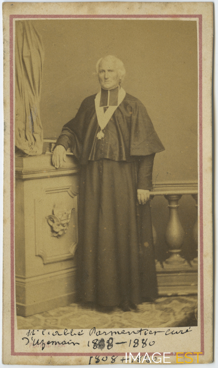 Portrait de " M. l'abbé Parmentier curé d'Uzemain 1808-1880 ", réalisé par le photographe Plubel, installé à Épinal (Vosges). Cette photographie est extraite d'un album contenant des portraits de nombreux prêtres ayant exercés dans le département des Vosges entre 1870 et 1910 environ.
