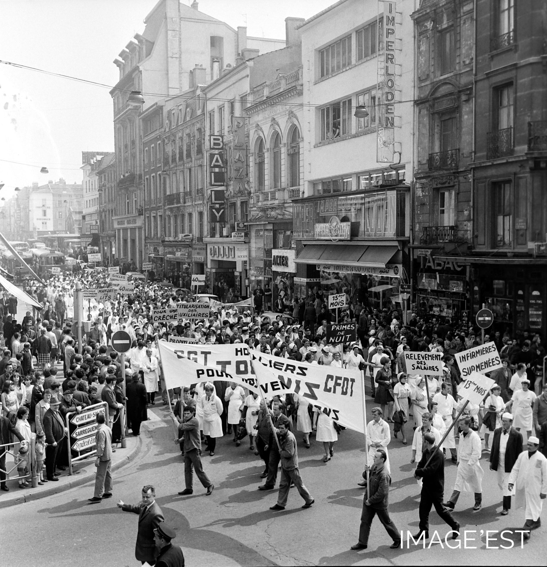 Défilé de manifestants du secteur médical rue Saint-Dizier à Nancy (Meurtre-et-Moselle)) lors des journées de Mai 1968.