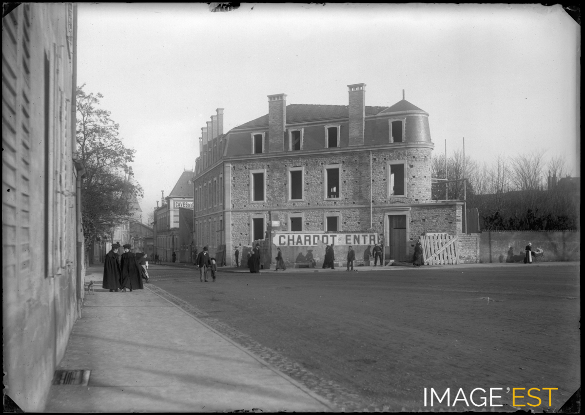 Maison Chardot à Nancy (Meurthe-et-Moselle). " Les Caves de la Craffe étaient situées au 11, rue de la Craffe. Son histoire commence avec l'ouverture d'une modeste épicerie en 1865 par Charles Chardot (1834-1920). Ce premier établissement se spécialise rapidement dans le commerce de vin en gros. La Maison Chardot, ainsi appelée avant-guerre, figurait parmi les grandes enseignes commerciales de la ville. On doit à Jules Chardot (1864-1938), fils du fondateur, la construction des premiers entrepôts de la rue de la Craffe en 1897 " (Source : https://www.image-est.fr/itineraires-coeur-de-ville-nancy-1146-52-0-0.html - Étape H Caves de la Craffe). La Maison Chardot a été construite par l'architecte Lucien Weissenburger (1860-1929) entre 1905 et 1905 pour Jules Chardot, négociant en vins à Nancy. Elle est située au 52, Cours Léopold. On remarquera l'ancien mur de l'épicerie dont l'enseigne est encore lisible sur un pan de mur en ruine.