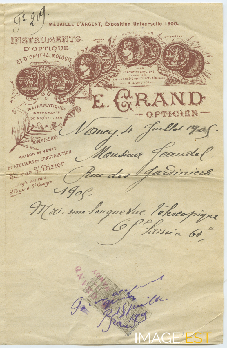 Facture à en-tête de la Maison E. Grand (opticien) installée à l'angle des rues Saint-Dizier et Saint-Georges à Nancy (Meurthe-et-Moselle).