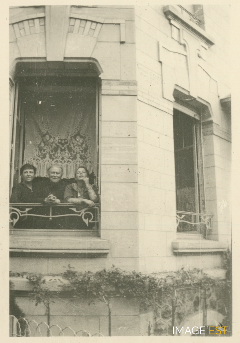Berthe Kalis (1876-1947) avec sa mère et sa fille Geneviève à la fenêtre de la demeure familiale au 5, avenue Georges Clemenceau à Nancy (Meurthe-et-Moselle), construite en 1911 par le frère de Berthe, Fernand César (1879-1969) architecte DPLG de l'École de Nancy. Sur une pierre à gauche de la fenêtre de droite figure l'inscription : " Fernand CÉSAR - Arch. DPLG - 1911 ". (Source : Archives privées des familles Kalis-Moreau).