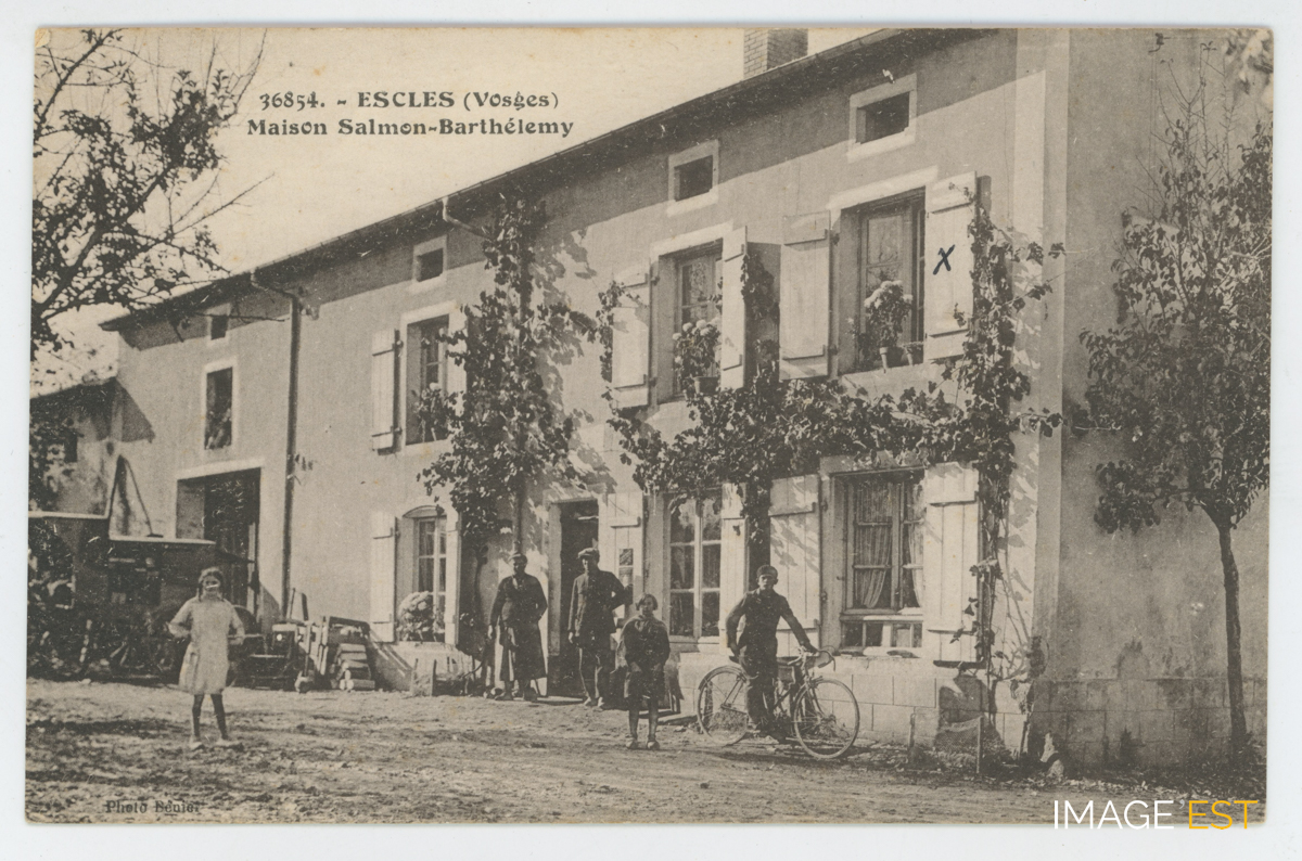 Maison Salmon-Barthélémy à Escles (Vosges). Dans la correspondance, il est précisé : " C'est d'Escles dans les Vosges que je vous envoie cette carte. C'est la maison où nous sommes en vacances, la croix indique notre chambre. Bientôt nous decendrons à Lincheux ". Signé " Edmé ".