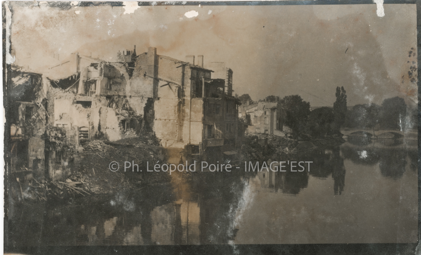 Maison en ruines bordant un cours d'eau après les bombardements de la Première Guerre mondiale à Verdun (Meuse).