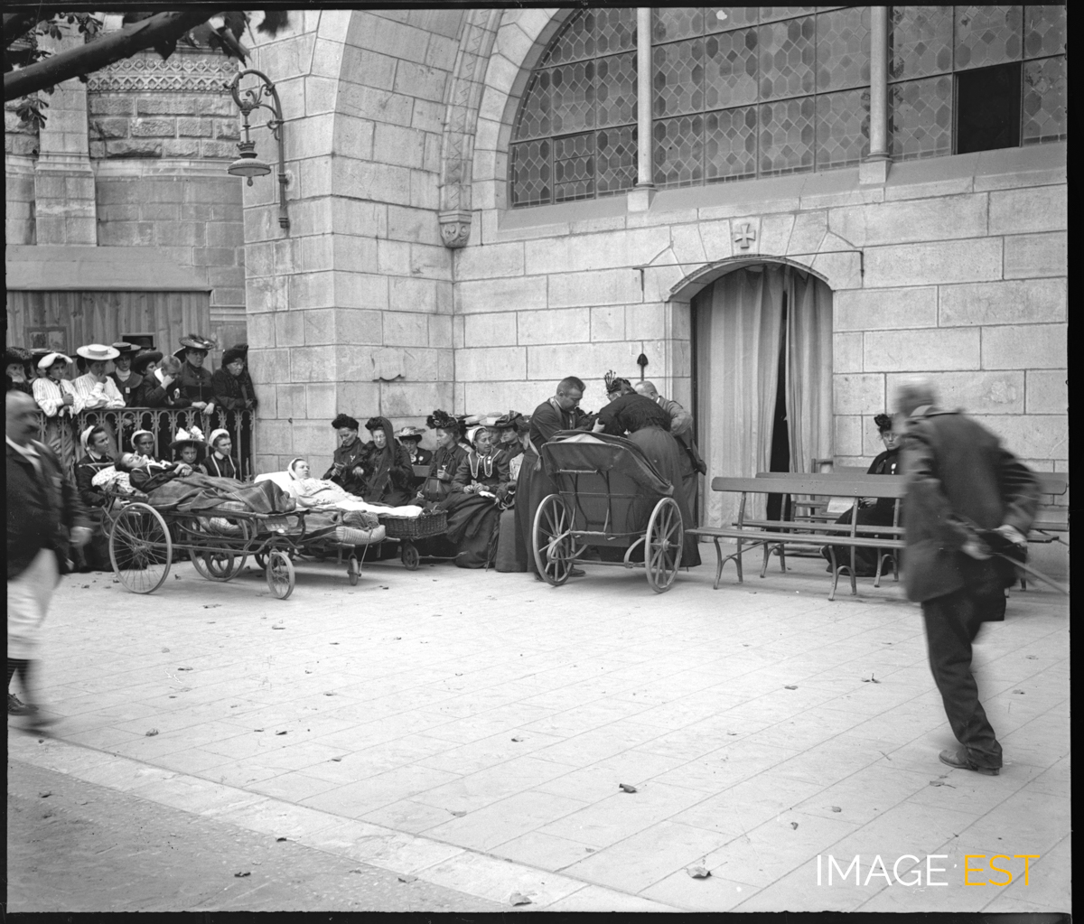 Malades sur des brancards et fauteuils roulants attendant pour les bains publics féminins lors d'un pèlerinnage à Lourdes (Hautes-Pyrénées).