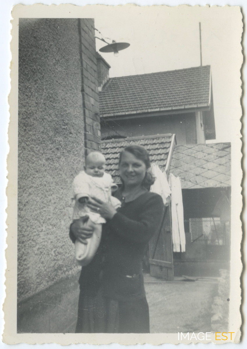 Aimée Philippe et son fils Jean-Pierre 14, rue Pasteur aux cités Solvay à Maxéville (Meurthe-et-Moselle). Au verso une annotation précise : " JPierre et sa Maman 1946 ".