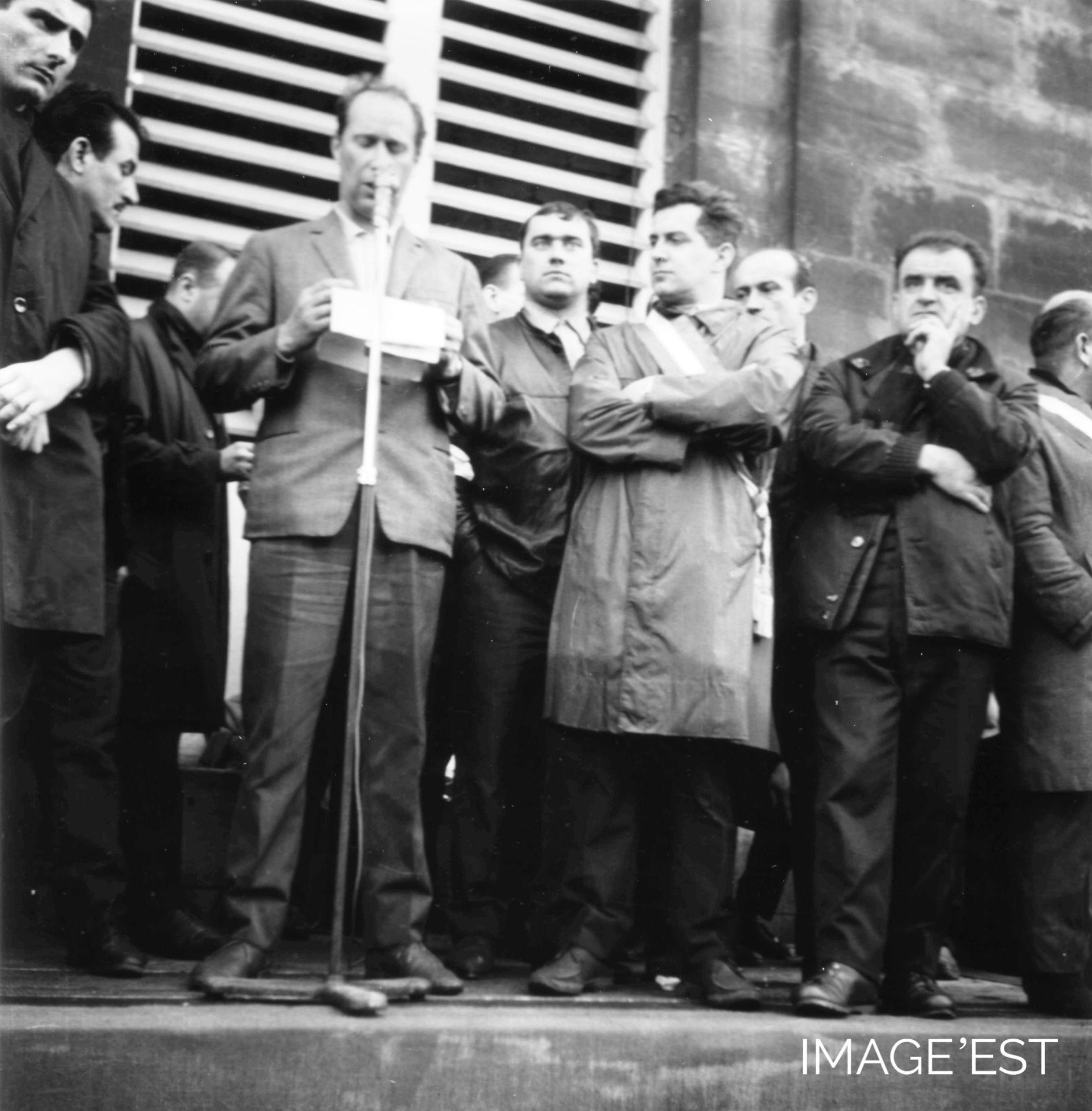 Discours syndical prononcé d'une tribune sur la place d'Armes à Metz (Moselle) lors d'une manifestation ouvrière le 6 avril 1966.
