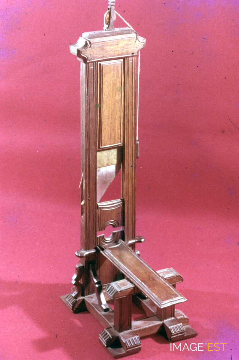 La Lorraine sous la Révolution. Maquette d'une guillotine au cinquantième, en noyer, ornement de salon possédant une lame tranchante pour sectionner de petits flacons de verre, de forme humaine, remplis d'eau rougie et parfumée. En marge de la diapositive figure la mention : " 7. Maquette de guillotine (vers 1795) ". Séries de diapositives sélectionnées et commentées par Jean Hurstel, directeur du Service éducatif des Musées de l'Académie de Nancy-Metz.