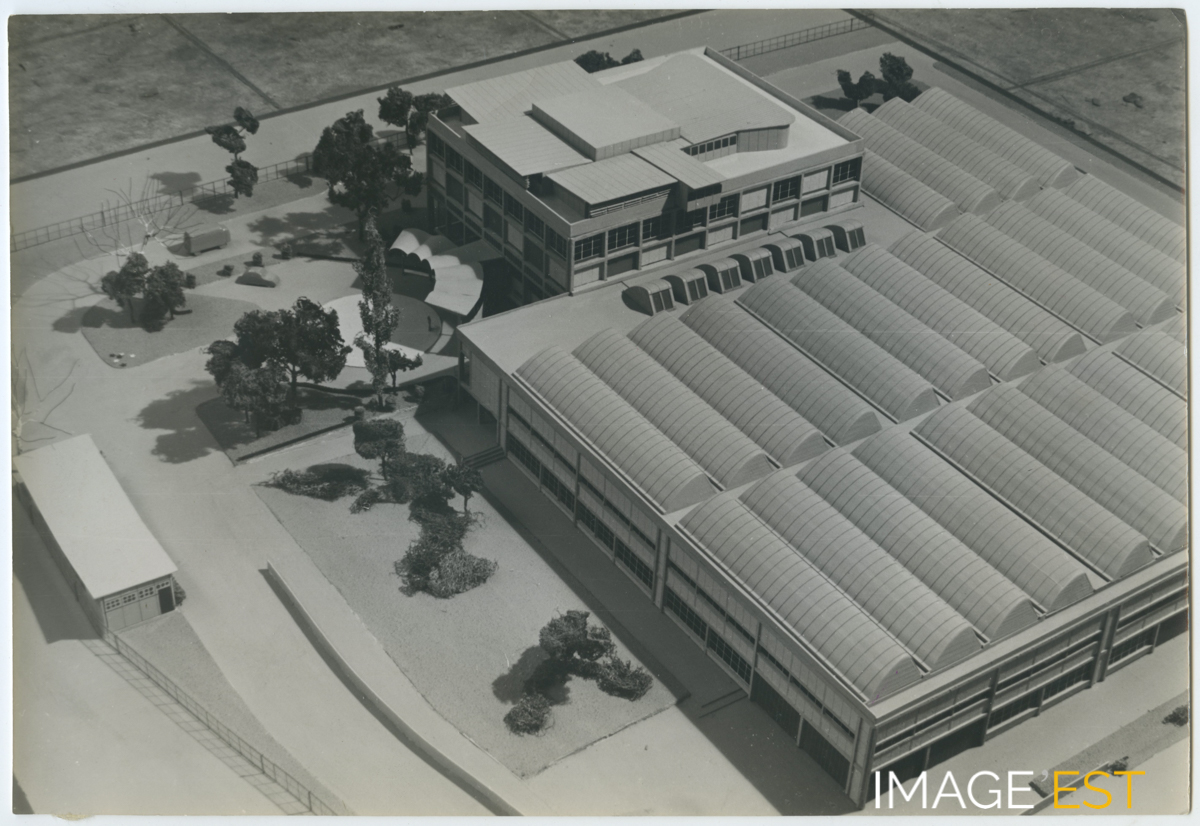Maquette de l'imprimerie Mame à Tours (Indre-et-Loire) conçue par Jean Prouvé (1901-1984). On trouvera de précieuses informations sur le site de la Cité de l'architecture et du patrimoine via ce lien : https://expositions-virtuelles.citedelarchitecture.fr/EXPO-ZEHRFUSS/02-PARTIE-01.html