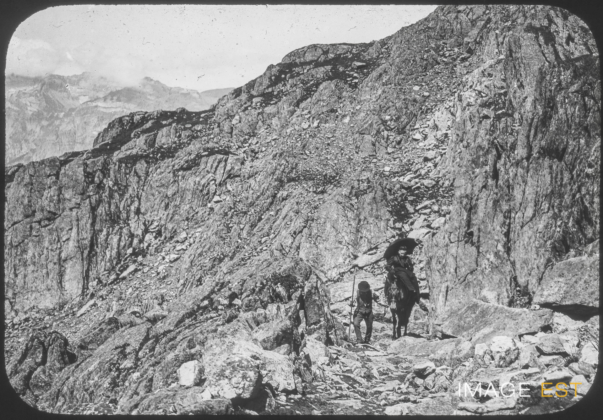 Femme sur une mule et guide, probablement en Haute-Savoie.