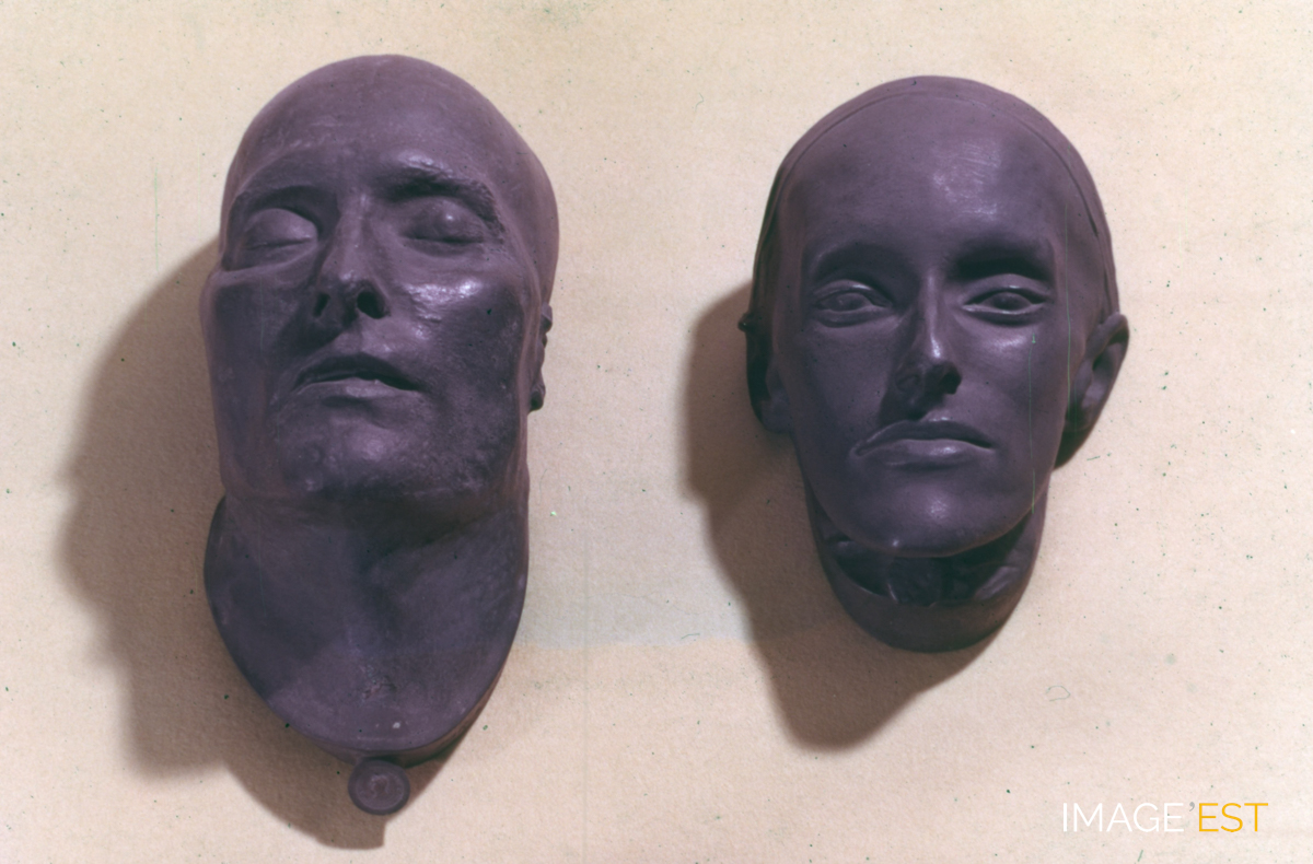 La Lorraine sous le Consulat et le Ier Empire. Le masque mortuaire en bronze de Napoléon Ier et celui de son fils moulage en plâtre patiné bronze. En marge de la diapositive figure la mention : " 10. Masques mortuaires de Napoléon Ier (+1821 et de Napoléon II (+1832) ". Séries de diapositives sélectionnées et commentées par Jean Hurstel, directeur du Service éducatif des Musées de l'Académie de Nancy-Metz.
