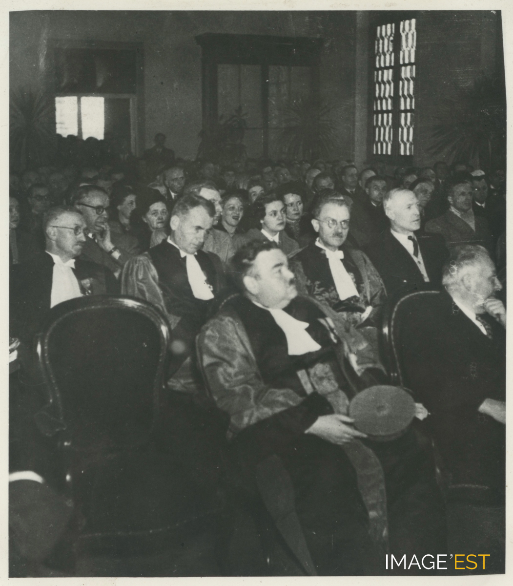Public rassemblé lors d'une allocution de Maurice Letort (1907-1972), professeur à la faculté des Sciences de Nancy et directeur de l'École nationale supérieure des industries chimiques de Nancy (ENSIC) de 1946-1956 (Source : https://cths.fr/an/savant.php?id=112672#). Ce cliché est extrait d'un album en cuir, format à l'italienne (16 x 23 cm).
