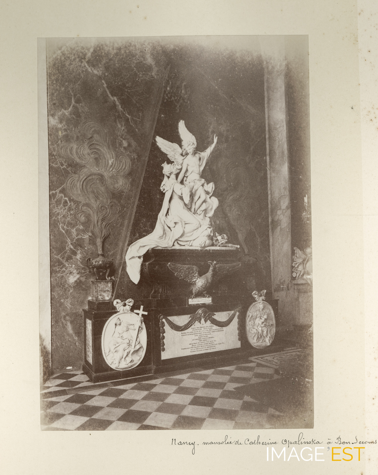 Mausolée de Catherine Opalinska en l'église de Bonsecours à Nancy (Meurthe-et-Moselle) en 1888. Cette photographie est extraite d'un album intitulé " J. D. 1888 " comprenant 75 tirages albuminés contrecollés sur carton, pris par le lieutenant-colonel Joseph Jules Delarue (1839-1925), commandant le 50e régiment territorial d'infanterie de Nancy et membre actif de la prestigieuse Société Lorraine de Photographie (fondée à Nancy en 1894) à laquelle il adhère en 1895 (Bulletin de la Société Lorraine de Photographie, n°3 septembre 1895).