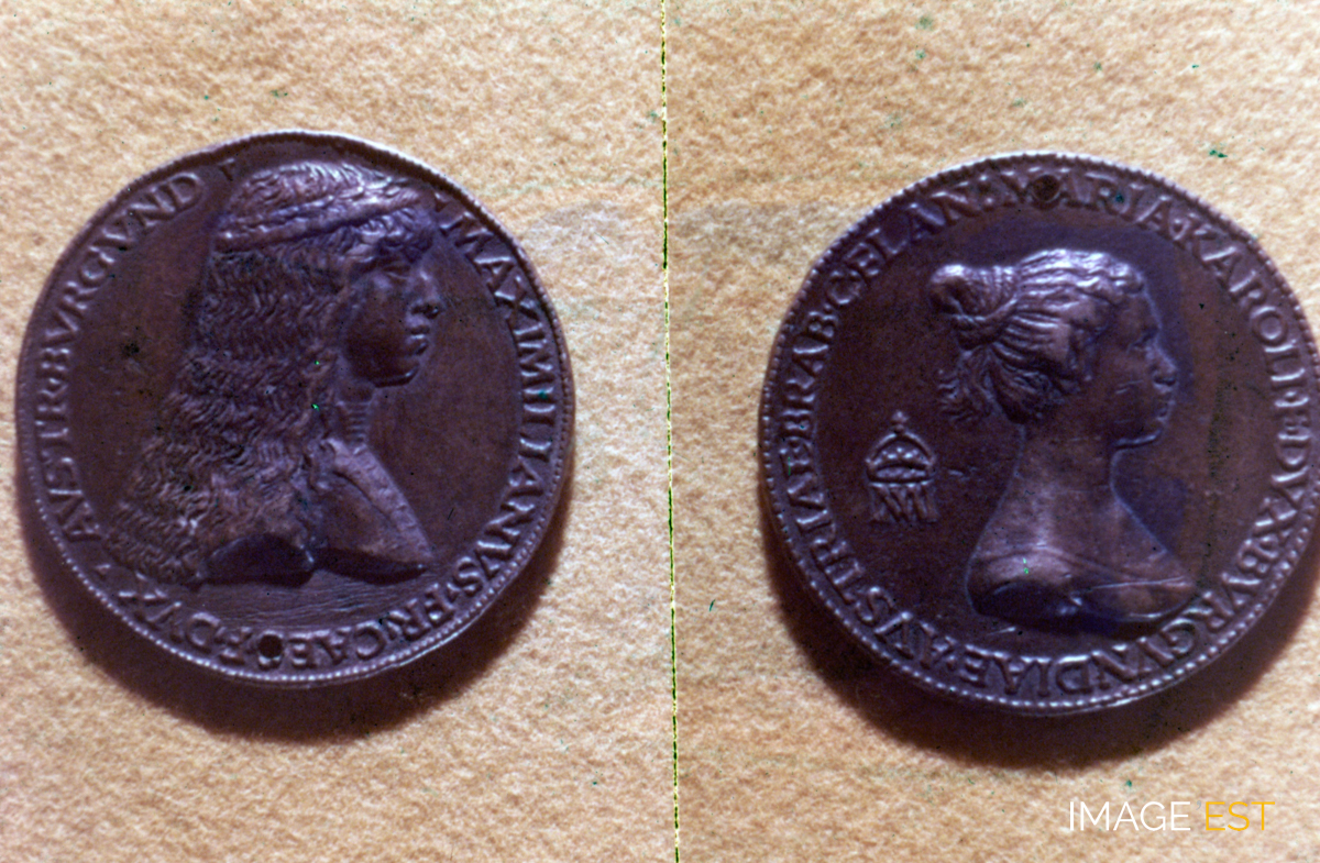 La bataille de Nancy (1477). Médaille de bronze du médailleur napolitain Giovanni Candida (1450-1504) à l'effigie de Marie de Bourgogne et de Maximilien de Habsbourg. En marge de la diapositive figure la mention : " 8. Médaille de bronze aux effigies de Marie de Bourgogne et de Maximilien de Habsbourg par Jean de Candida. 1477-1479 ". Séries de diapositives sélectionnées et commentées par Jean Hurstel, directeur du Service éducatif des Musées de l'Académie de Nancy-Metz.