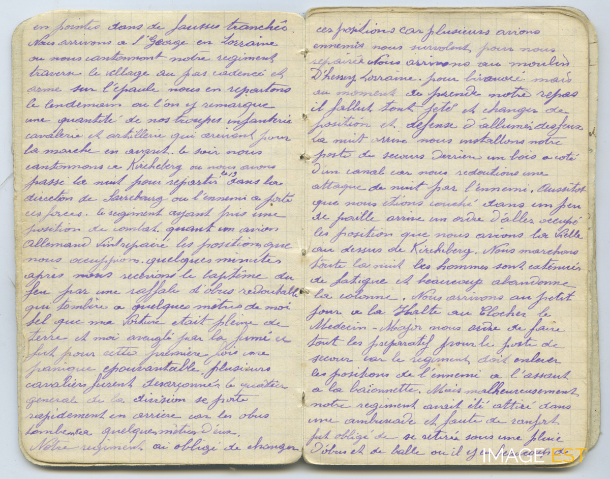 Page d'un journal intitulé « Mémoires de la campagne 1914 - Baron Émile, conducteur voiture médicale 56e infanterie Classe 1902 » composé par Émile Baron (1882-1938), né à Saint-Léger-sur Dheune (Saône-Loire). Le régiment arrive à Saint-Georges (Moselle) commune traversée au pas cadencé, arme sur l'épaule et s'y installe pour la nuit. Il en repart le lendemain vers Kircheberg (Haut-Rhin). Le 19 août, direction Sarrebourg (Moselle) où l'ennemi a concentré ses forces, le régiment se met en position de combat, aussitôt repéré par un avion il essuie un lourd bombardement et se retranche à Hesse (Moselle) où il ne peut rester l'attaque continuant. Au milieu de la nuit, il reçoit l'ordre de reprendre les positions de la veille à Kircheberg (Haut-Rhin), cette marche de nuit est difficile, les hommes fatiguent. À peine arrivé à Halte-au-Clocher (Moselle) un poste de secours doit être installé en vue d'un assaut mais il s'avère qu'il a été attiré dans une embuscade et, faute de renfort, doit se retirer sous une pluie d'obus.
