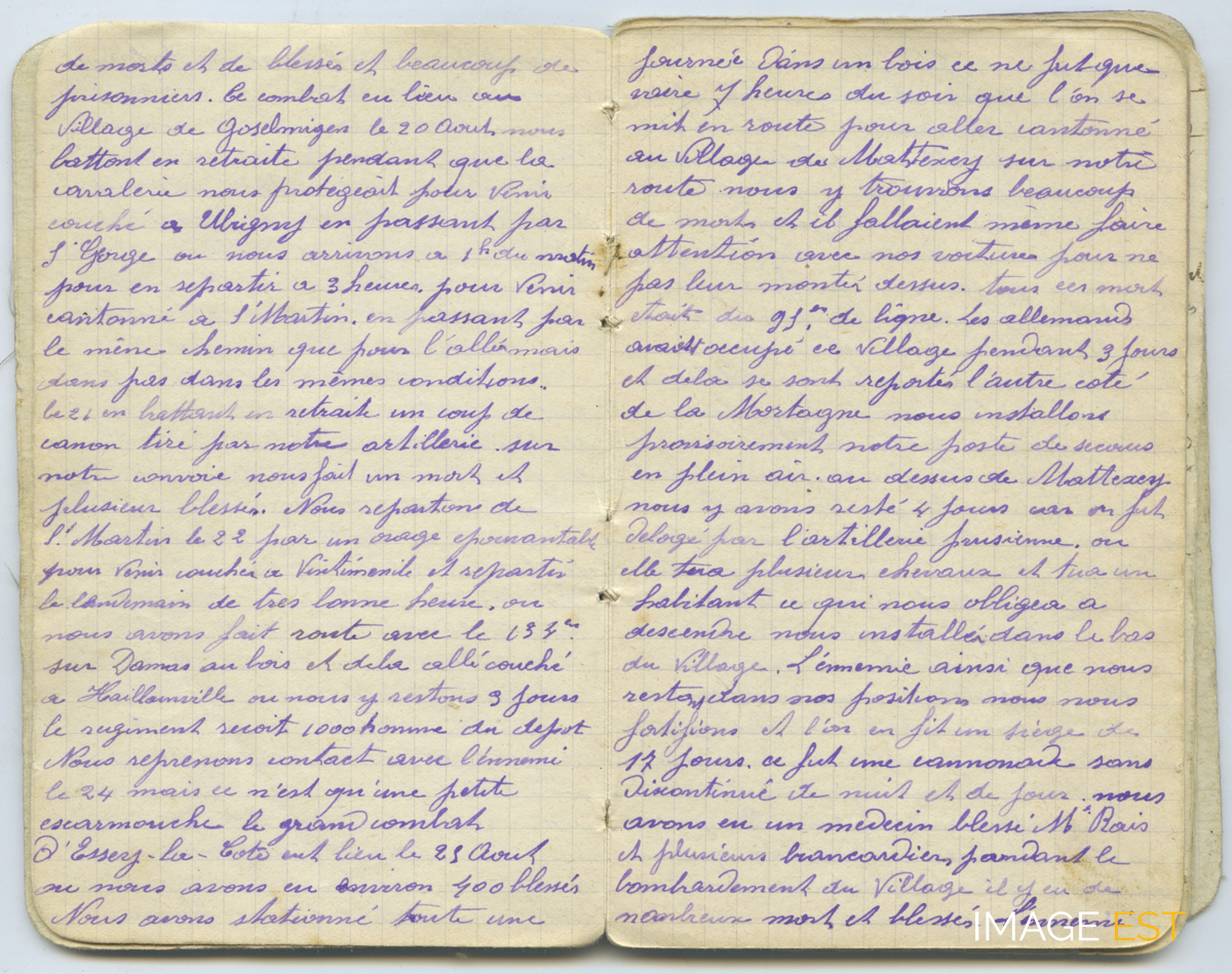 Page d'un journal intitulé « Mémoires de la campagne 1914 - Baron Émile, conducteur voiture médicale 56e infanterie Classe 1902 » composé par Émile Baron (1882-1938), né à Saint-Léger-sur Dheune (Saône-Loire). Le combat s'est déroulé à Gosselming (Moselle), il y a beaucoupd de morts, blessés et prisonniers ; sous la protection de la cavalerie, le régiment se replie, couche à Ibigny (Moselle) en passant par Saint-Georges (Moselle) avant de repartir pour Saint-Martin (Meurthe-et-Moselle). Même chemin qu'à l'aller mais dans des conditions plus dangereuses. Erreur de tir de leur artillerie un mort et des blessés. Le 22 septembre, départ de Saint-Martin (Meurthe-et-Moselle) pour Vioménil (Vosges) sous un orage ; accompagné du 134e régiment, route vers Damas-aux-Bois (Vosges) puis Haillainville (Vosges) où il reste trois jours, il y a un renfort de 1000 hommes, petite escarmouche le 24 septembre mais le 25 un grand combat à Essey-la-Côte (Meurthe-et-Moselle), il y a 400 blessés. Il reste dans un petit bois toute la journée avant de se rendre à Mattexey (Meurthe-et-Moselle), il doit faire attention de ne pas écraser les nombreux morts du 95e qui jonchent la route ; ce village a été occupé par les allemands,qui sont repassés de l'autre côté de la Mortagne, leur artillerie fait feu jour et nuit pendant un siège de dix-sept jours, beaucoupd de morts et de blessés dont le médecin M. Rais et des brancardiers.