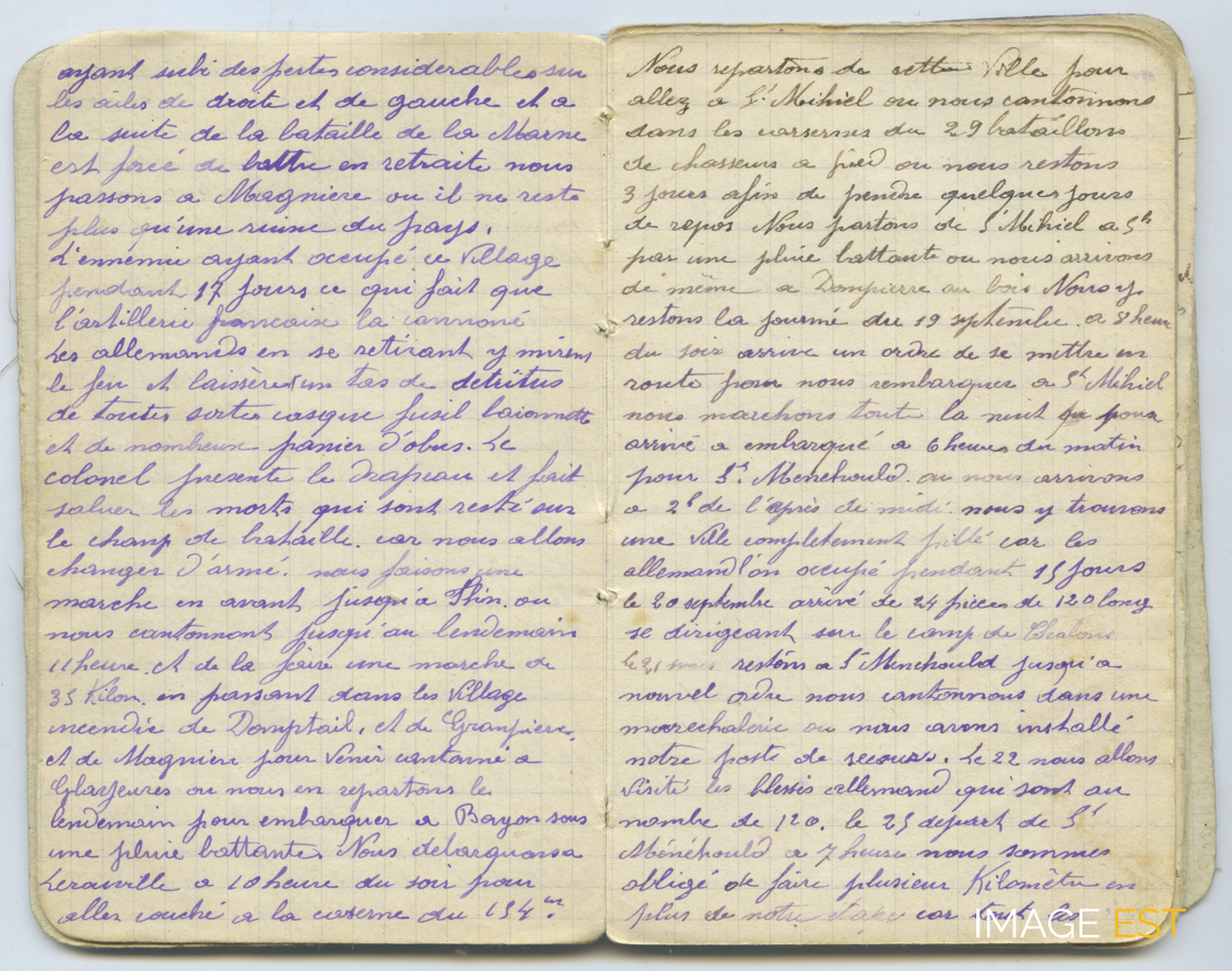 Page d'un journal intitulé « Mémoires de la campagne 1914 - Baron Émile, conducteur voiture médicale 56e infanterie Classe 1902 » composé par Émile Baron (1882-1938), né à Saint-Léger-sur Dheune (Saône-Loire). L'ennemi, ayant lui aussi subi des pertes considérables, est forcé de battre en retraite. Le régiment poursuit sa route, passe à Magnières (Meurthe-et-Moselle) totalement dévasté, bombardé pendant 17 jours par les canons français et incendié par les allemands en se retirant. Àprès un hommage rendu aux morts, il se met en marche vers Flin (Meurthe-et-Moselle) en passant par les villages dévastés de Domptail (Vosges), Saint-Pierremont (Vosges), à nouveau Magnières (Meurthe-et-Moselle) pour venir cantonner jusqu'au lendemain à Clayeures (Meurthe-et-Moselle). Le lendemain, sous une pluie battante, il monte dans un train à Bayon (Meurthe-et-Moselle), débarque le soir à Lérouville (Meuse) puis va à Saint-Mihiel (Meuse), logeant dans les casernes du 29e bataillon de chasseurs à pied pendant trois jours, puis va pour la journée du 19 septembre à Dompierre-aux-Bois (Meuse) où ordre est donné de rembarquer pour Saint-Mihiel (Meuse) puis pour Sainte-Menehould (Marne), complètement pillée, le poste de secours est installé jusqu'au 25 septembre dans une maréchalerie (atelier du maréchal ferrant) où l'on soigne aussi des blessés allemands.