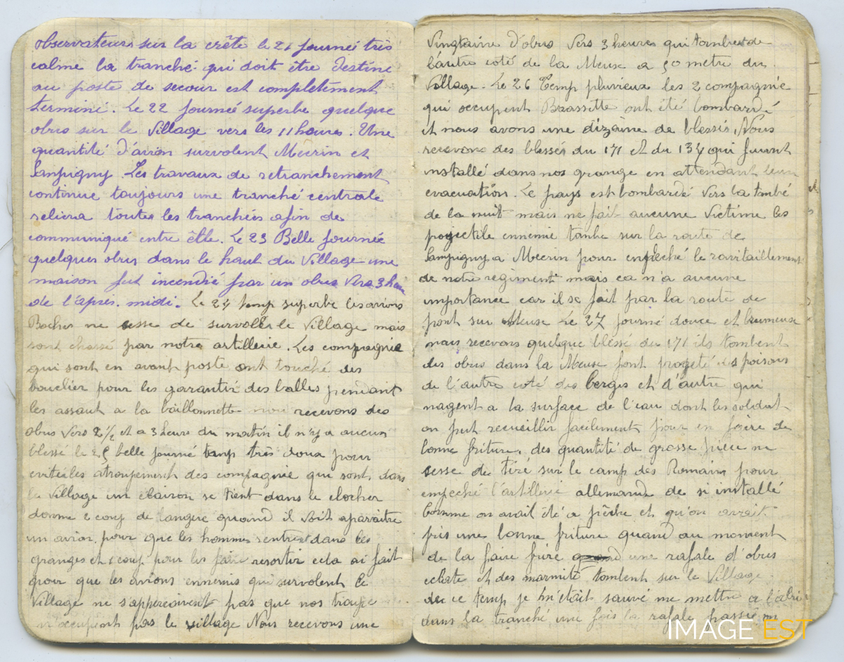 Page d'un journal intitulé « Mémoires de la campagne 1914 - Baron Émile, conducteur voiture médicale 56e infanterie Classe 1902 » composé par Émile Baron (1882-1938), né à Saint-Léger-sur Dheune (Saône-Loire). Au " Camp des Romains " présence d'observateurs ennemis. La journée du 21 octobre est calme, le poste de secours est terminé ; le 22, temps superbe, des avions allemands survolent Mécrin (Meuse) et Sampigny (Meuse), quelques obus tombent ; les travaux de retranchement continuent avec le projet d'une tranchée centrale qui reliera toutes les autres entre elles ; le 23 octobre, une maison du village est bombardée ; le 24 octobre, survol d'avions ennemis chassés par notre artillerie ; des boucliers sont distribués aux avant-postes pour les protéger des balles pendant les assauts à la baillonnette. Pour éviter que les avions ennemis ne repèrent la position des troupes un clairon est installé en haut du clocher : deux " coups de langue " (sonnerie) on s'abrite, un seul on peut ressortir. Le 26 octobre, les deux compagnies de Brasseitte (Meuse) sont bombardées, le poste de secours reçoit les blessés dans sa grange avant leur évacuation. Pensant couper le ravitaillement, l'ennemi bombarde la route de Sampigny (Meuse) à Mécrin, mais celui-ci se fait par la route de Pont-sur-Meuse (Meuse). L'artillerie vise sans cesse le Camp des Romain pour éviter que l'ennemi ne s'y s'installe. Les obus qui tombent dans la rivière projettent des poissons que les soldats dégustent en friture, mais au moment du repas un obus force à se sauver pour se mettre à l'abri dans la tranchée.