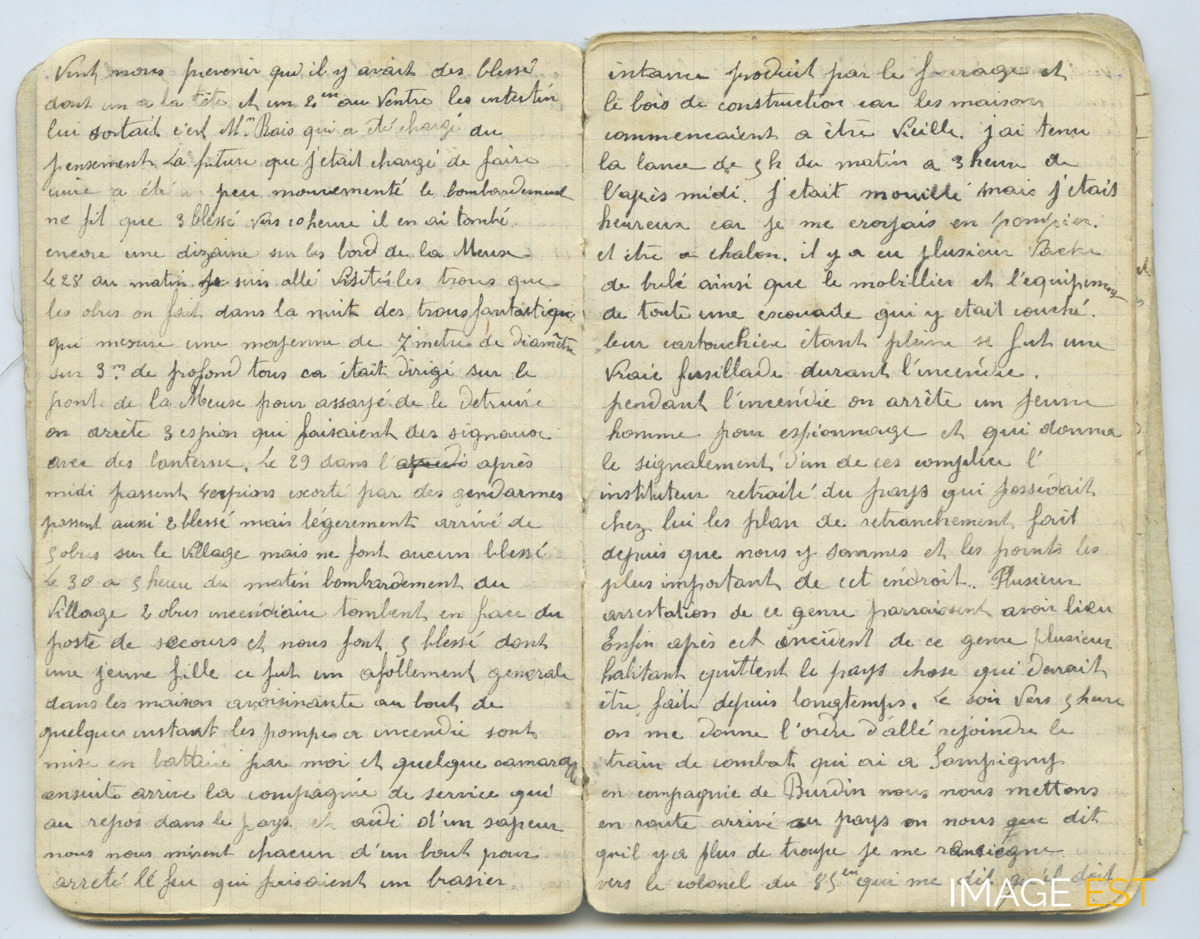 Page d'un journal intitulé « Mémoires de la campagne 1914 - Baron Émile, conducteur voiture médicale 56e infanterie Classe 1902 » composé par Émile Baron (1882-1938), né à Saint-Léger-sur Dheune (Saône-Loire). Des blessés arrivent, des cas sont très graves. Le 28 octobre, observation et description des trous d'obus (sept métres de diamètre sur trois de profondeur), bombardement pour tenter de détruire le pont sur la Meuse. Le 29 octobre, arrestation d'espions escortés par des gendarmes. Le 30 octobre, des bombes incendiaires tombent sur le village déclanchant une panique, il ya des blessés dont une jeune fille ; sapeurs et compagnies de service mettent en place les pompes à incendie pour éteindre l'intense brasier du fourrage et bois de construction. Pendant l'incendie un jeune homme est arrêté pour espionnage, son complice, un ancien instituteur, possédant des plans de nos positions. Suite à ce désastre, les habitants quittent le pays. Ordre est donné de rejoindre Sampigny (Meuse) où il n'y a plus de troupes.