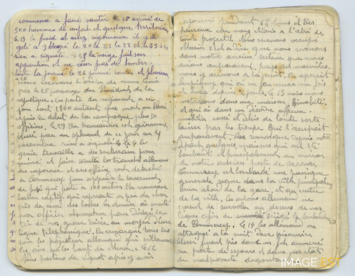 Page d'un journal intitulé « Mémoires de la campagne 1914 - Baron Émile, conducteur voiture médicale 56e infanterie Classe 1902 » composé par Émile Baron (1882-1938), né à Saint-Léger-sur Dheune (Saône-Loire). À Vignot (Meuse) arrivée,le 18 novembre, de 500 hommes de renfort et quelques territoriaux. Gelées et chutes de neige, il ne se passe rien.Le 28 novembre, visite du président de la République, Raymond Poincaré. Depuis le début du conflit, le régiment a perdu 2300 hommmes (morts et blessés), plus de 50 officiers. On teste du nouveau matériel : fusil, ballon...et tous les soirs le projecteur allemand balaie les hauteurs meusiennes. Le 2 décembre, retour à Mécrin (Meuse) " pays des marmites " , c'est-à-dire en zone plus dangereuse; Sampigny (Meuse) brûle à l'horizon ; installation dans une maison saccagée ; les avions allemands ne cessent de bombarder Commercy (Meuse) principalement la gare, panique générale.